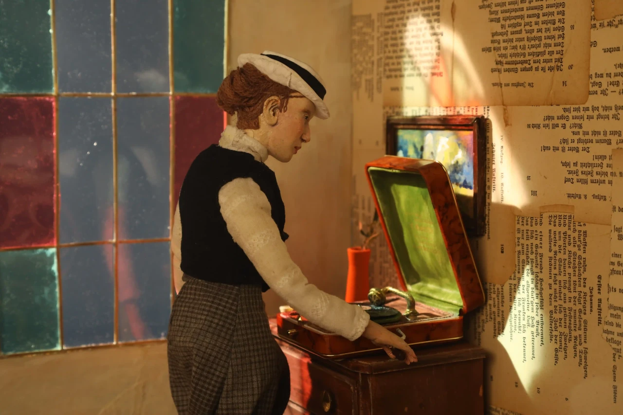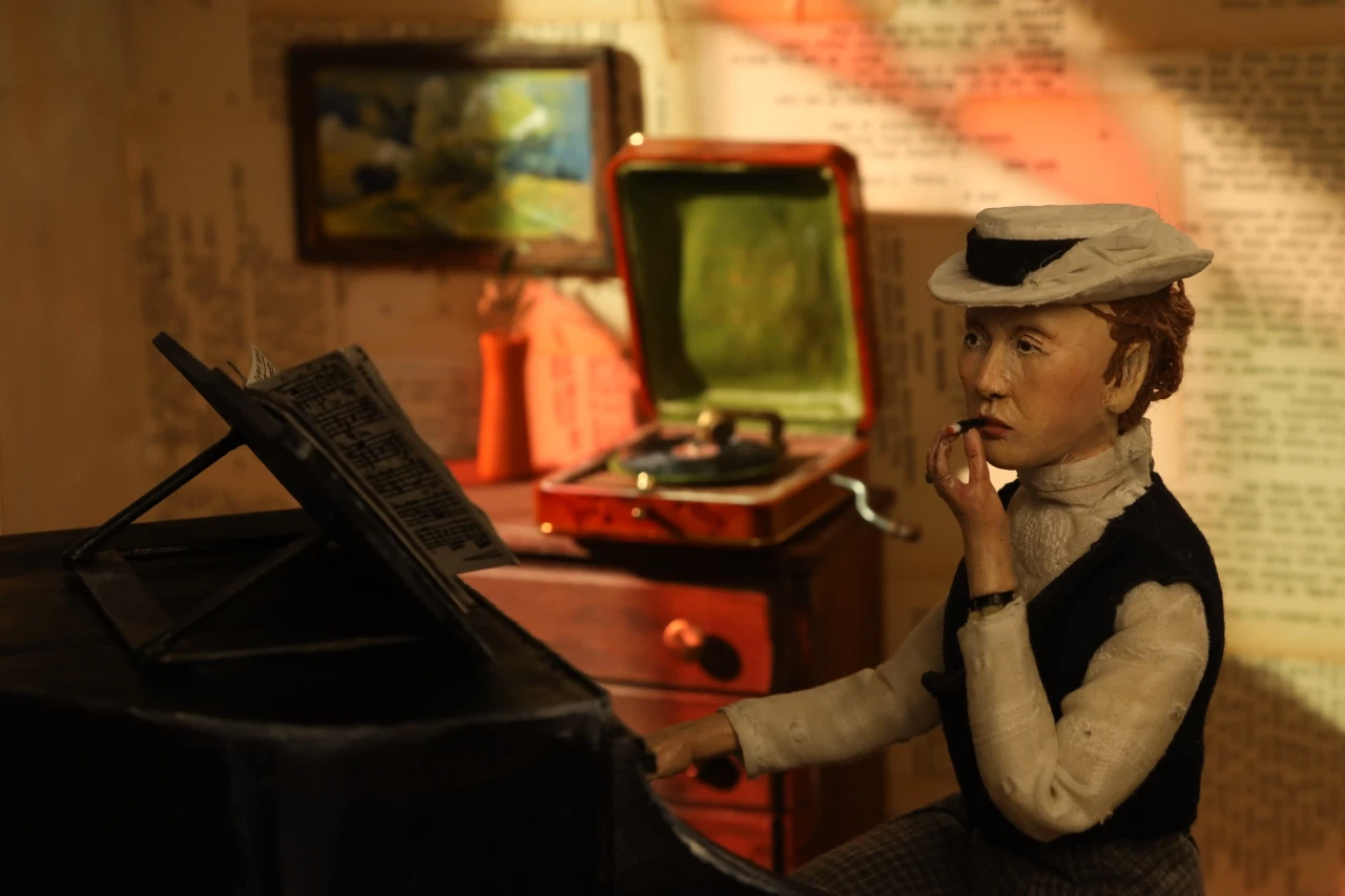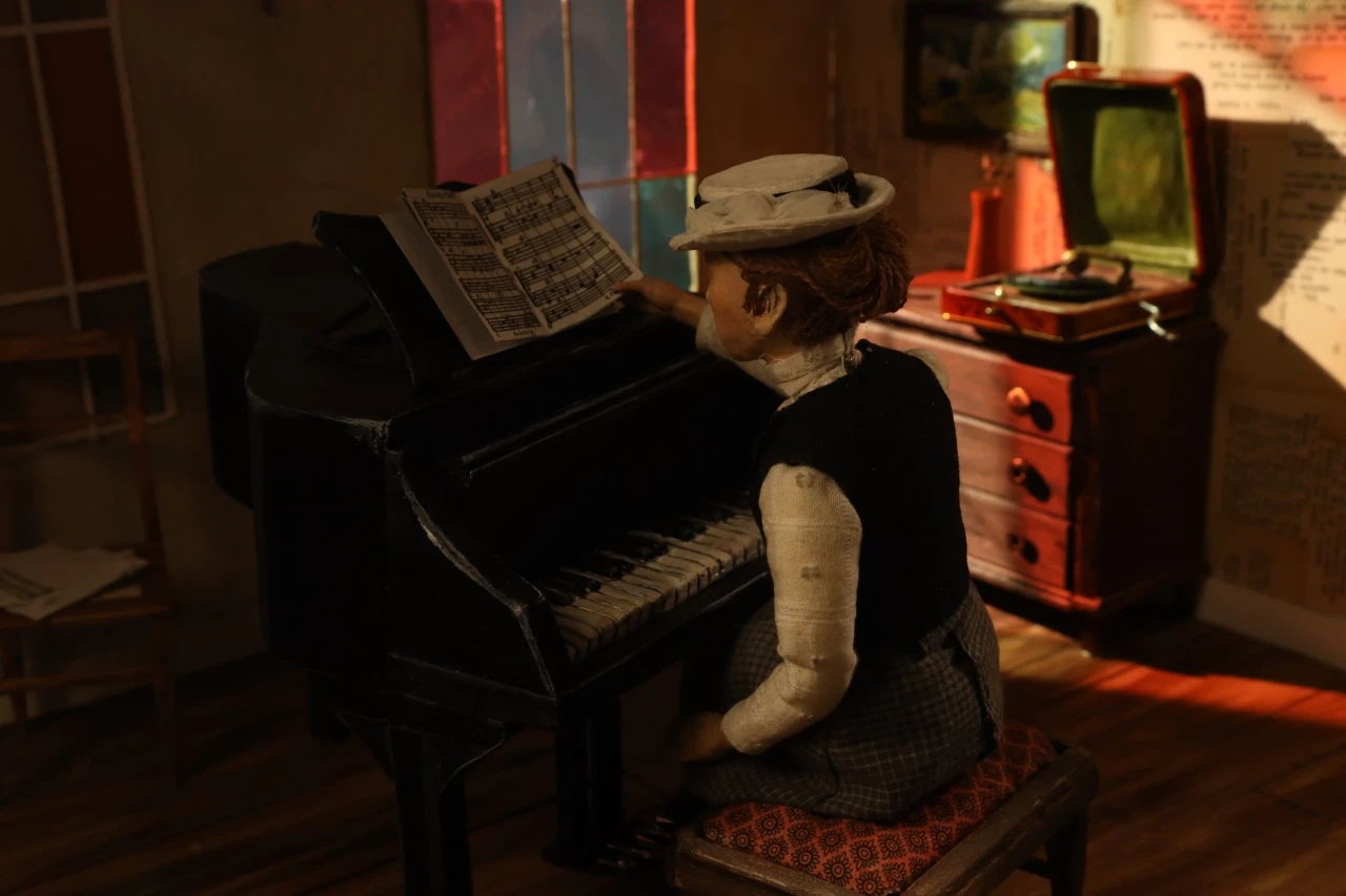 ►Mit welchem Thema hast du dich in deinem Projekt befasst? Ich habe mich in meinem Stop-Motion-Kurzfilmprojekt mit der Autorin Annette Kolb beschäftigt. Angefangen hat alles mit dem Kurs ‹Das Portrait im Puppenbau›. In dem Kurs sollten wir uns für den 90. Jahrestag der Bücherverbrennung eine*n Autor*in aussuchen, die damals von den Nationalsozialisten auf die schwarze Liste gesetzt oder deren Werke verbrannt wurden und ein Portrait in der Form einer Puppe anfertigen. ►Wer war Annette Kolb? Annette Kolb [1870 –1967] war eine deutsch-französische Autorin und Pazifistin. Kolb positionierte sich öffentlich gegen die Kriegsverherrlichung, radikalen Nationalismus und Antisemitismus. Besonders bekannt wurde Annette Kolb für ihre Werke, die oft gesellschaftliche und politische Themen behandelten. Ihr Roman ‹Die Schaukel› aus dem Jahr 1919 ist ein Beispiel für ihr literarisches Schaffen, das auch ihre pazifistische Haltung widerspiegelte. Sie war zudem eine der ersten Frauen, die in Deutschland eine öffentliche politische Meinung vertrat und sich für die Frauenbewegung einsetzte. Nachdem die Nationalsozialisten 1933 die Macht in Deutschland übernommen hatten, wurde Annette Kolb aufgrund ihrer politischen Überzeugungen verfolgt. Sie floh aus Deutschland nach Paris, dann nach New York. Sie starb mit 97 in München. Sämtliche Schriften Annette Kolbs wurden von den Nazis auf die ‹Liste des schädlichen und unerwünschten Schrifttums› gesetzt. ►Kannst du deinen Arbeitsprozess beschreiben? Angefangen habe ich mit dem Bau der Puppe. Dafür habe ich einen Umriss der Körperform auf ein DIN-A3-Blatt gezeichnet. Also einen Entwurf, wie die Puppe aussehen soll. Um das Skelett zu bauen, habe ich Aluminiumdraht genommen und ihn um sich selbst gezwirbelt. Für die steifen Teile des Skeletts habe ich Kaltmetall verwendet. Also die Oberarme, Unterarme, Hüfte et cetera. Die Stellen am Draht, die frei bleiben, sind also die beweglichen Gelenke. Daraufhin habe ich den Umriss des Körpers auf ein Stück Sofa-Schaumstoff gelegt und den Umriss abgezeichnet. Der Sofa-Schaumstoff wurde dann mit einem Cutter in die Hälfte geschnitten und das Skelett hinein geklebt. Den Schaumstoff habe ich daraufhin mithilfe einer Nagelschere in Form geschnitten. Den Kopf, die Hände und die Füße habe ich nach einem Foto aus Superskulpy modelliert, im Ofen gebacken und mit Acrylfarbe bemalt. Für die Kleider habe ich aus Kreppband Schnittmuster gemacht und aus Kleidern, die ich im Secondhand-Laden gekauft habe, per Hand zusammengenäht. Die Haare habe ich aus Wolle gemacht und an den Kopf geklebt, den Hut aus Pappe, Kreppband und Stoff gebastelt. Die Möbel im Set sind aus Balsaholz geschnitzt und mit Acrylfarbe bemalt. Spaß hat es mir gemacht, die Konstruktion eines ‹echten› Klaviers und einer ‹echten› Kommode zu verstehen und dann in Miniatur nachzubauen. Details wie die Knäufe an der Kommode sind Jeans-Knöpfe aus dem Nähschränkchen meiner Oma und die Pedalen des Flügels sind in der Hälfte geknipste Sicherheitsnadeln. Der Holzfußboden besteht aus Pappe und ist mit Acrylfarbe bemalt. Ein großes Highlight des Sets ist das Buntglasfenster. Das haben Luzie Kutz und ich per Hand in der Schmiedewerkstatt ihrer Mutter zusammen geschmiedet. Neun Stunden hat das Ganze gedauert. Daraufhin habe ich mir bunte Plastikfolien besorgt und hinter die Fensterchen geklebt. Anschließend ging es in die Stop-Motion-Höhle von Björn Verloh. Er hat Luzie [sie hat an ihrem eigenen Set gearbeitet] und mir gezeigt, wie man das Programm Dragonframe benutzt, das Licht einstellt und alles drum herum aufbaut. Etwa zwei Monate haben wir animiert und dann wurde alles zusammengeschnitten von Daha Yeo. Ihre Tante Suug hat netterweise den Soundtrack gemacht und Jakob Schuback und ich haben die Soundeffekte gemacht. Die Puppe und das Set wurden im Rahmen des Literaturfestivals ‹Hamburg liest verbrannte Bücher› im Ausstellungsraum der Staatsbibliothek mit anderen Puppen-Sets aus meinem Kurs ausgestellt. Es wurden noch andere Werke, Animationen, Comics und Illustrationen und Zines ausgestellt, die im Rahmen des Literaturfestivals in parallel laufenden Kursen entstanden sind. Im Metropolis-Kino wurden dann unsere Animationen gezeigt. ►Was hast du während des Projekts gelernt? Ich habe während des Arbeitsprozesses gelernt, wie man eine Stop-Motion-Puppe und ein Set inklusive Möbel baut, wie man einen Film animiert und daraufhin mit Schnittprogrammen zusammenbringt. Ich habe gelernt, wie man geduldig ist und wie die Liebe zum Detail ein Projekt am Ende großartig macht. ►Was war die größte Herausforderung für dich? Die größte Herausforderung war, geduldig zu sein. Der Prozess ist sehr langsam und wenn man nicht gerade im Studio ist, arbeitet man sehr viel alleine. Das hat mich, mit dem Zeitstress, zum Teil ein wenig verrückt gemacht. Ich habe manche Wochen komplett in meinem Zimmer mit Werkeln verbracht und das einzige, worüber ich mit meinen Mitbewohnern sprechen konnte, war dieses Thema, da ich wortwörtlich nichts anderes gemacht habe. Wenn ich in Zukunft an einem neuen Stop-Motion-Film arbeite, werde ich auf jeden Fall darauf achten, genug Zeit einzuplanen und mit anderen Leuten zusammenzuarbeiten. ►Was ist dein Fazit? Alles in allem war dieses Projekt eine lebensverändernde Erfahrung für mich. Ich habe damit eine neue Richtung bekommen, in die ich beruflich gehen möchte. Vielen Dank, Sara-Christin Richter, dass du uns dies durch deinen Kurs ermöglicht hast. Vielen Dank an meine Mitstudierenden, dass wir in enger Zusammenarbeit durch dieses Riesenprojekt gegangen sind. Großen Dank an Björn Verloh, der uns auf Schritt und Tritt in unserem Prozess unterstützt und gelehrt hat. Vielen Dank an Alexandra Kardinar, die unser Animationsprojekt am Ende betreut und besprochen hat. Am meisten danke ich aber meiner Freundin und Mitstudentin, genialer Miniatur-Bauerin und kreativem Kopf Luzie Kutz. Ohne 