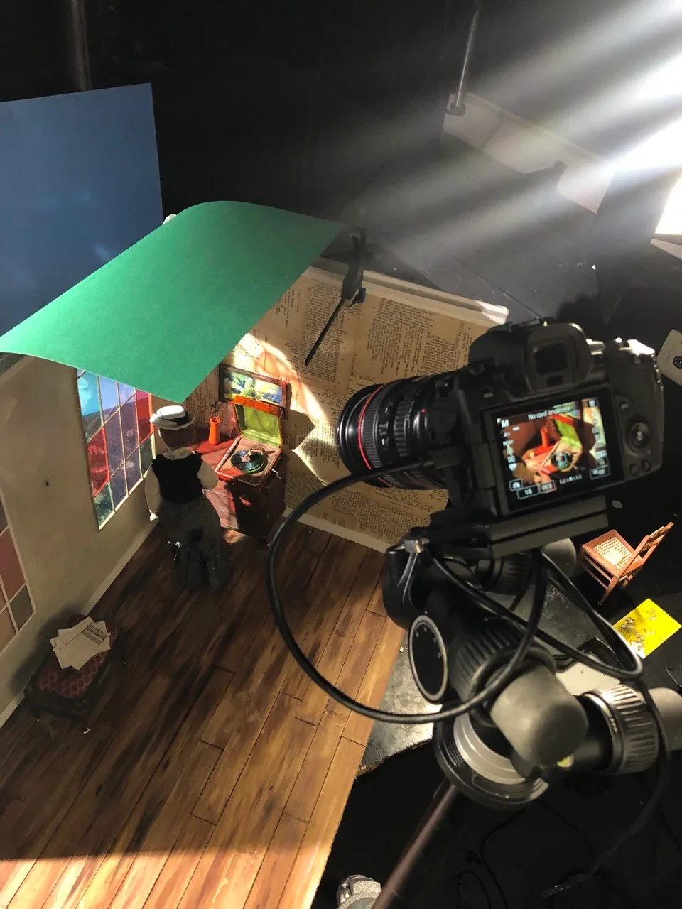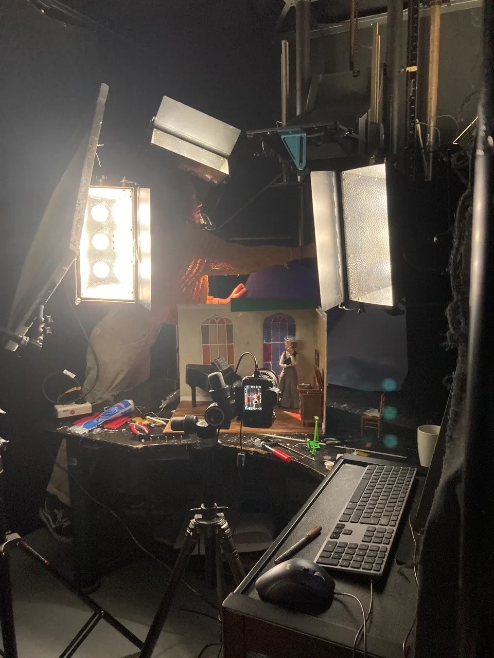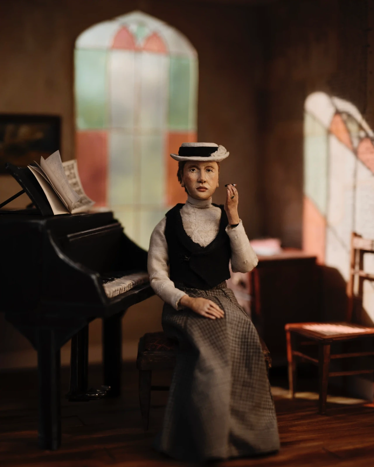 ►Mit welchem Thema hast du dich in deinem Projekt befasst? Ich habe mich in meinem Stop-Motion-Kurzfilmprojekt mit der Autorin Annette Kolb beschäftigt. Angefangen hat alles mit dem Kurs ‹Das Portrait im Puppenbau›. In dem Kurs sollten wir uns für den 90. Jahrestag der Bücherverbrennung eine*n Autor*in aussuchen, die damals von den Nationalsozialisten auf die schwarze Liste gesetzt oder deren Werke verbrannt wurden und ein Portrait in der Form einer Puppe anfertigen. ►Wer war Annette Kolb? Annette Kolb [1870 –1967] war eine deutsch-französische Autorin und Pazifistin. Kolb positionierte sich öffentlich gegen die Kriegsverherrlichung, radikalen Nationalismus und Antisemitismus. Besonders bekannt wurde Annette Kolb für ihre Werke, die oft gesellschaftliche und politische Themen behandelten. Ihr Roman ‹Die Schaukel› aus dem Jahr 1919 ist ein Beispiel für ihr literarisches Schaffen, das auch ihre pazifistische Haltung widerspiegelte. Sie war zudem eine der ersten Frauen, die in Deutschland eine öffentliche politische Meinung vertrat und sich für die Frauenbewegung einsetzte. Nachdem die Nationalsozialisten 1933 die Macht in Deutschland übernommen hatten, wurde Annette Kolb aufgrund ihrer politischen Überzeugungen verfolgt. Sie floh aus Deutschland nach Paris, dann nach New York. Sie starb mit 97 in München. Sämtliche Schriften Annette Kolbs wurden von den Nazis auf die ‹Liste des schädlichen und unerwünschten Schrifttums› gesetzt. ►Kannst du deinen Arbeitsprozess beschreiben? Angefangen habe ich mit dem Bau der Puppe. Dafür habe ich einen Umriss der Körperform auf ein DIN-A3-Blatt gezeichnet. Also einen Entwurf, wie die Puppe aussehen soll. Um das Skelett zu bauen, habe ich Aluminiumdraht genommen und ihn um sich selbst gezwirbelt. Für die steifen Teile des Skeletts habe ich Kaltmetall verwendet. Also die Oberarme, Unterarme, Hüfte et cetera. Die Stellen am Draht, die frei bleiben, sind also die beweglichen Gelenke. Daraufhin habe ich den Umriss des Körpers auf ein Stück Sofa-Schaumstoff gelegt und den Umriss abgezeichnet. Der Sofa-Schaumstoff wurde dann mit einem Cutter in die Hälfte geschnitten und das Skelett hinein geklebt. Den Schaumstoff habe ich daraufhin mithilfe einer Nagelschere in Form geschnitten. Den Kopf, die Hände und die Füße habe ich nach einem Foto aus Superskulpy modelliert, im Ofen gebacken und mit Acrylfarbe bemalt. Für die Kleider habe ich aus Kreppband Schnittmuster gemacht und aus Kleidern, die ich im Secondhand-Laden gekauft habe, per Hand zusammengenäht. Die Haare habe ich aus Wolle gemacht und an den Kopf geklebt, den Hut aus Pappe, Kreppband und Stoff gebastelt. Die Möbel im Set sind aus Balsaholz geschnitzt und mit Acrylfarbe bemalt. Spaß hat es mir gemacht, die Konstruktion eines ‹echten› Klaviers und einer ‹echten› Kommode zu verstehen und dann in Miniatur nachzubauen. Details wie die Knäufe an der Kommode sind Jeans-Knöpfe aus dem Nähschränkchen meiner Oma und die Pedalen des Flügels sind in der Hälfte geknipste Sicherheitsnadeln. Der Holzfußboden besteht aus Pappe und ist mit Acrylfarbe bemalt. Ein großes Highlight des Sets ist das Buntglasfenster. Das haben Luzie Kutz und ich per Hand in der Schmiedewerkstatt ihrer Mutter zusammen geschmiedet. Neun Stunden hat das Ganze gedauert. Daraufhin habe ich mir bunte Plastikfolien besorgt und hinter die Fensterchen geklebt. Anschließend ging es in die Stop-Motion-Höhle von Björn Verloh. Er hat Luzie [sie hat an ihrem eigenen Set gearbeitet] und mir gezeigt, wie man das Programm Dragonframe benutzt, das Licht einstellt und alles drum herum aufbaut. Etwa zwei Monate haben wir animiert und dann wurde alles zusammengeschnitten von Daha Yeo. Ihre Tante Suug hat netterweise den Soundtrack gemacht und Jakob Schuback und ich haben die Soundeffekte gemacht. Die Puppe und das Set wurden im Rahmen des Literaturfestivals ‹Hamburg liest verbrannte Bücher› im Ausstellungsraum der Staatsbibliothek mit anderen Puppen-Sets aus meinem Kurs ausgestellt. Es wurden noch andere Werke, Animationen, Comics und Illustrationen und Zines ausgestellt, die im Rahmen des Literaturfestivals in parallel laufenden Kursen entstanden sind. Im Metropolis-Kino wurden dann unsere Animationen gezeigt. ►Was hast du während des Projekts gelernt? Ich habe während des Arbeitsprozesses gelernt, wie man eine Stop-Motion-Puppe und ein Set inklusive Möbel baut, wie man einen Film animiert und daraufhin mit Schnittprogrammen zusammenbringt. Ich habe gelernt, wie man geduldig ist und wie die Liebe zum Detail ein Projekt am Ende großartig macht. ►Was war die größte Herausforderung für dich? Die größte Herausforderung war, geduldig zu sein. Der Prozess ist sehr langsam und wenn man nicht gerade im Studio ist, arbeitet man sehr viel alleine. Das hat mich, mit dem Zeitstress, zum Teil ein wenig verrückt gemacht. Ich habe manche Wochen komplett in meinem Zimmer mit Werkeln verbracht und das einzige, worüber ich mit meinen Mitbewohnern sprechen konnte, war dieses Thema, da ich wortwörtlich nichts anderes gemacht habe. Wenn ich in Zukunft an einem neuen Stop-Motion-Film arbeite, werde ich auf jeden Fall darauf achten, genug Zeit einzuplanen und mit anderen Leuten zusammenzuarbeiten. ►Was ist dein Fazit? Alles in allem war dieses Projekt eine lebensverändernde Erfahrung für mich. Ich habe damit eine neue Richtung bekommen, in die ich beruflich gehen möchte. Vielen Dank, Sara-Christin Richter, dass du uns dies durch deinen Kurs ermöglicht hast. Vielen Dank an meine Mitstudierenden, dass wir in enger Zusammenarbeit durch dieses Riesenprojekt gegangen sind. Großen Dank an Björn Verloh, der uns auf Schritt und Tritt in unserem Prozess unterstützt und gelehrt hat. Vielen Dank an Alexandra Kardinar, die unser Animationsprojekt am Ende betreut und besprochen hat. Am meisten danke ich aber meiner Freundin und Mitstudentin, genialer Miniatur-Bauerin und kreativem Kopf Luzie Kutz. Ohne 