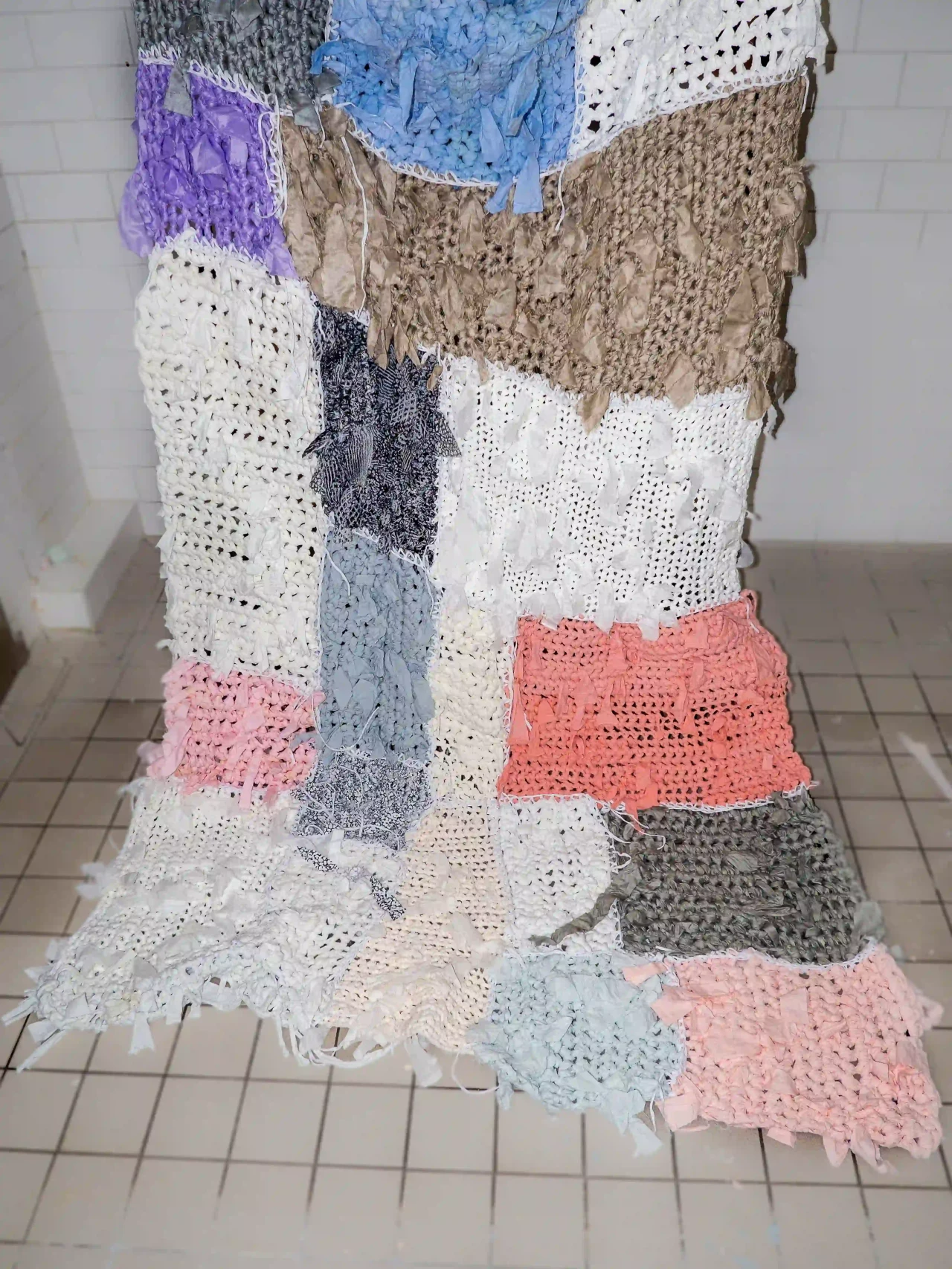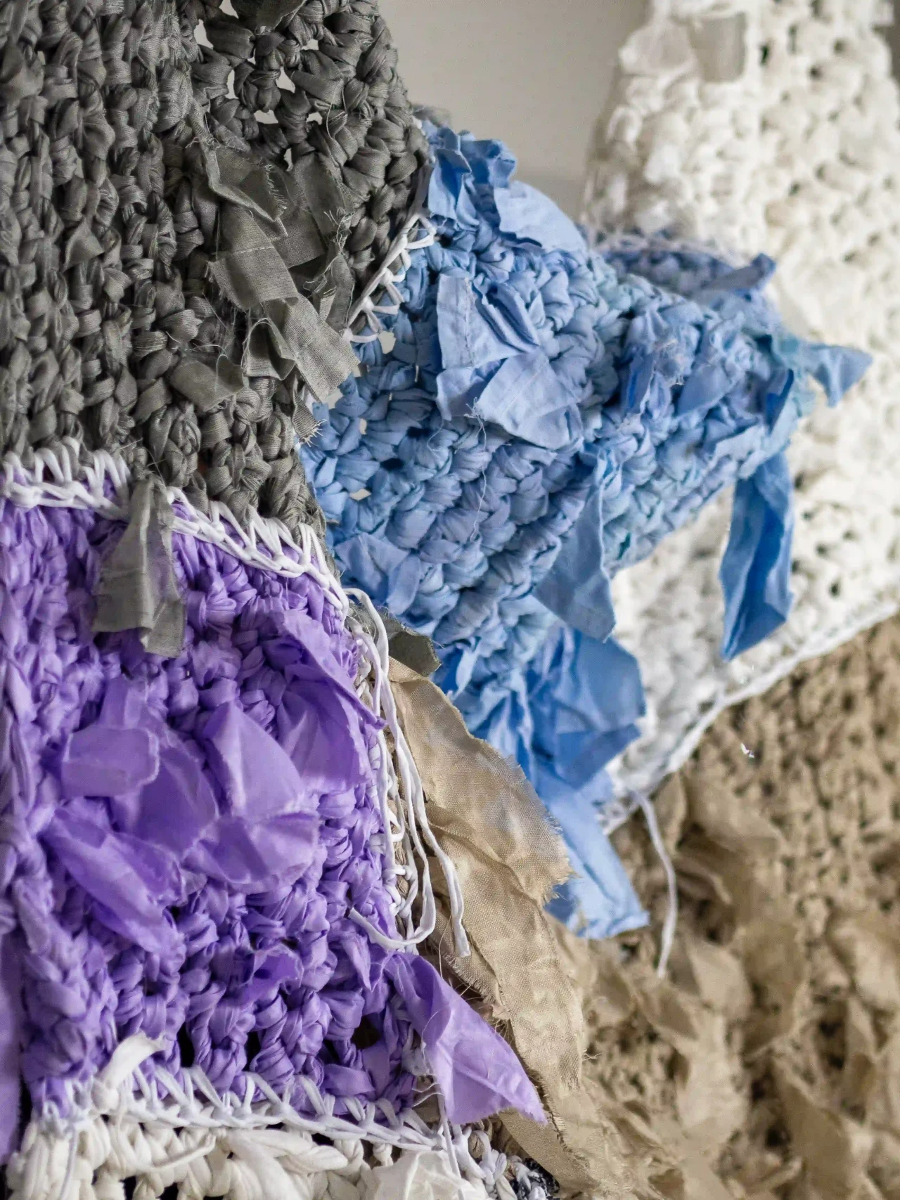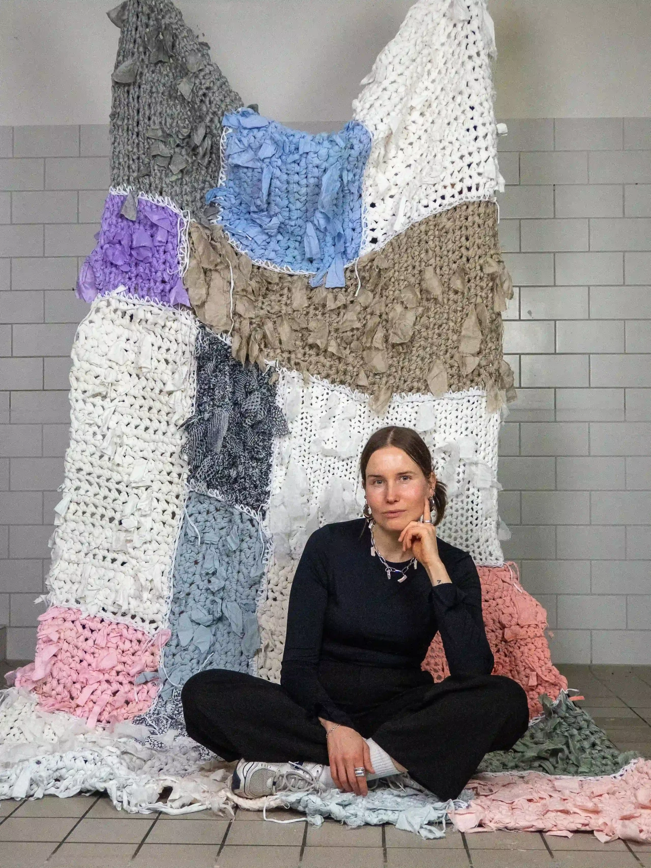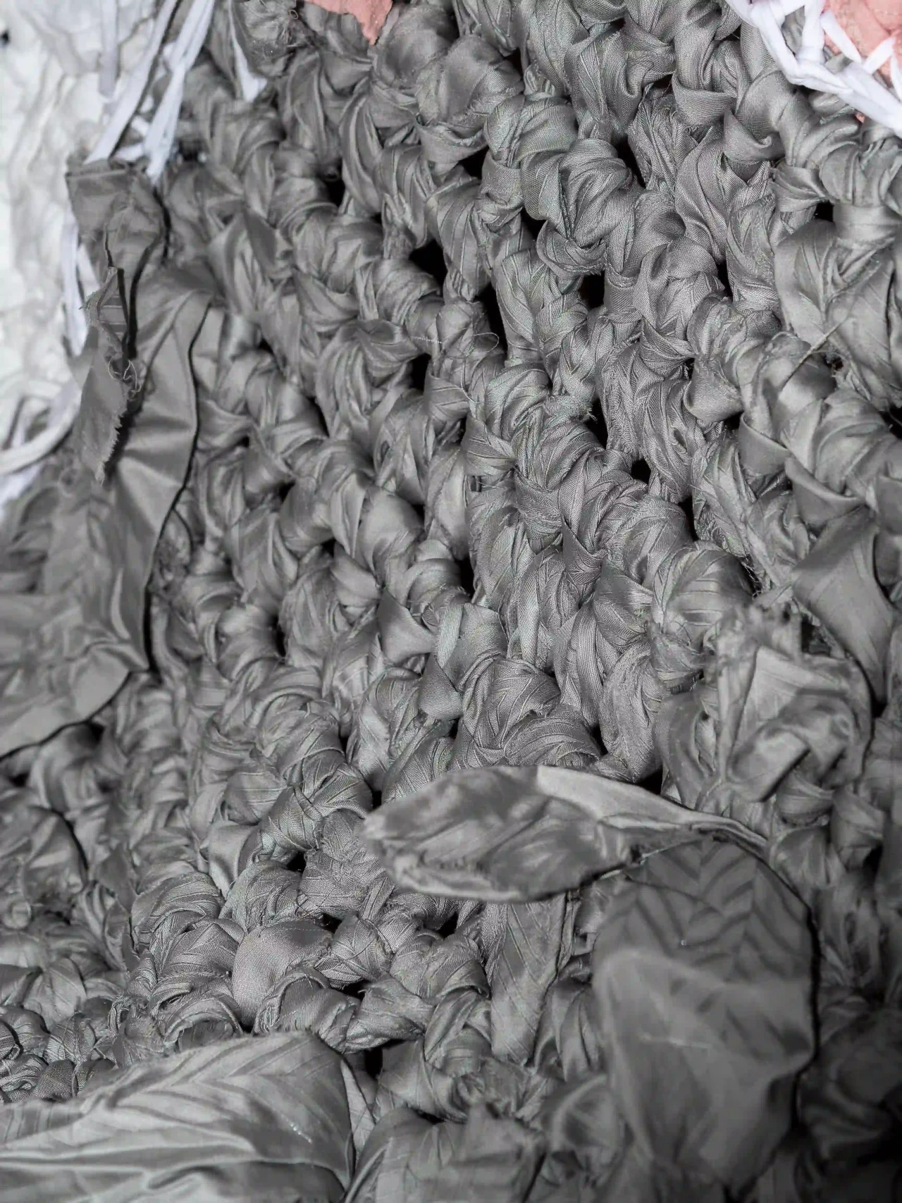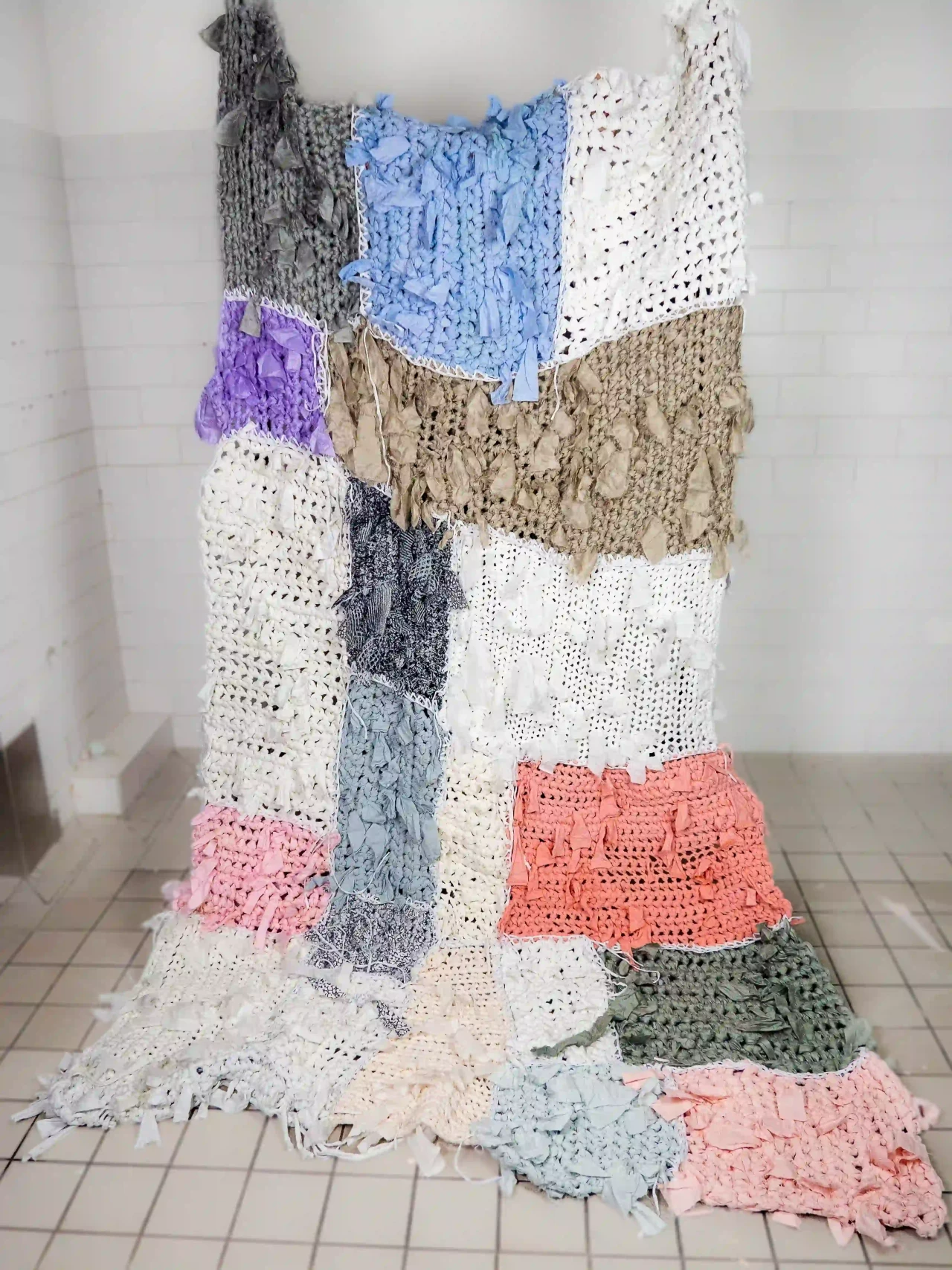 ►Kannst du uns dein Projekt beschreiben? Meine Arbeit umfasst ein Projekt ‹Textile Flächen in Größe› aus einem Textildesignkurs in dem der Fokus auf Größe und Plastizität liegen sollte. Meine Idee war es, Häkeltechniken mit nachhaltigen Materialien zu verknüpfen. ►Möchtest du eine besondere Botschaft oder Bedeutung durch deine Arbeit vermitteln? Das Thema ‹Nachhaltiges Design› ist so aktuell wie nie. So ist es mir wichtig mit meiner Arbeit darauf aufmerksam zu machen, dass Design und Nachhaltigkeit miteinander harmonieren können und gerade textiles Design hier sehr bedeutend sein kann. ►Mit welchen Techniken hast du gearbeitet? Da ich nachhaltige Materialien nutzen wollte, habe ich mich für Upcycling entschieden. Dazu habe ich über die Zeit ‹alltägliche Textilien› gesammelt, wie zum Beispiel Bettlaken, Stoffe, Vorhänge. Im nächsten Schritt habe ich diese Stoffe dann zu unterschiedlich dicken und breiten Streifen zerrissen und miteinander verhäkelt. Um den unterschiedlichen Größen und Breiten der Textilmengen gerecht zu werden, habe ich hier verschieden Häkelnadeln genutzt, die sich in der Stärke unterschieden haben. ►Kannst du uns von deinem Gestaltungsprozess erzählen? Beim Verarbeiten der gesammelten Textilien fand ich es gerade spannend, dass jede Materialität doch eine andere Struktur beim Verarbeiten aufweist. Als ich dann alle verschiedenen Flächen nebeneinandergelegt habe, um sie anschließend miteinander zu verknüpfen, war es besonders schön für mich zu sehen, wie die Gestaltung unterschiedliche Tiefen und Strukturen miteinander zu einer großen Fläche verbunden hat und doch jede einzelne Fläche für sich spricht. ►Was war die größte Herausforderung für dich? Bei der Hälfte der Menge nicht schon beim Verhäkeln aufzugeben. Es waren sehr viele Textilien, die ich gebraucht habe, um auf die angeforderte Fläche zu kommen. Außerdem hat es sehr viel Handkraft gebraucht, um das dicke Textil zu verarbeiten. ►Hast du ein Skizzenbuch? Ja, meistens schon. An dieses Projekt bin ich aber eher frei herangegangen und habe mir die Inspiration von anderen Flächen und Objektdesigns geholt, die ich gestalte. Ansonsten arbeite ich auch sehr gerne mit Moodboards und Collagen. ►Wo findest du Inspiration für deine Arbeiten? Neben Collagen und Moodboards finde ich meine Inspiration in anderen Flächen und Objektdesigns von mir. Ich bin nebenbei freie Künstlerin und wie es auch bei meiner Objekt und Leinwandkunst ist, gehe ich sehr gerne in die Tiefen, arbeite mit Strukturen und Plastizität und gestalte im ‹organischen Stil›. Wie auch bei diesem Textilprojekt. Mich fasziniert es, mit Materialien zu experimentieren und sie anschließen zu etwas Neuem zu gestalten oder rekonstruieren. Dabei besteht Textildesign nicht nur aus dem Design einer textilen Fläche. Es ist vielmehr eine Komposition, von Design und Textil in Objekt und Fläche und kann dabei in alle Arten und Dimensionen gehen. Design mit nachhaltigem Bewusstsein kann gerade bei Textildesign integriert werden. Das war mir bei meiner Arbeit hier besonders wichtig.