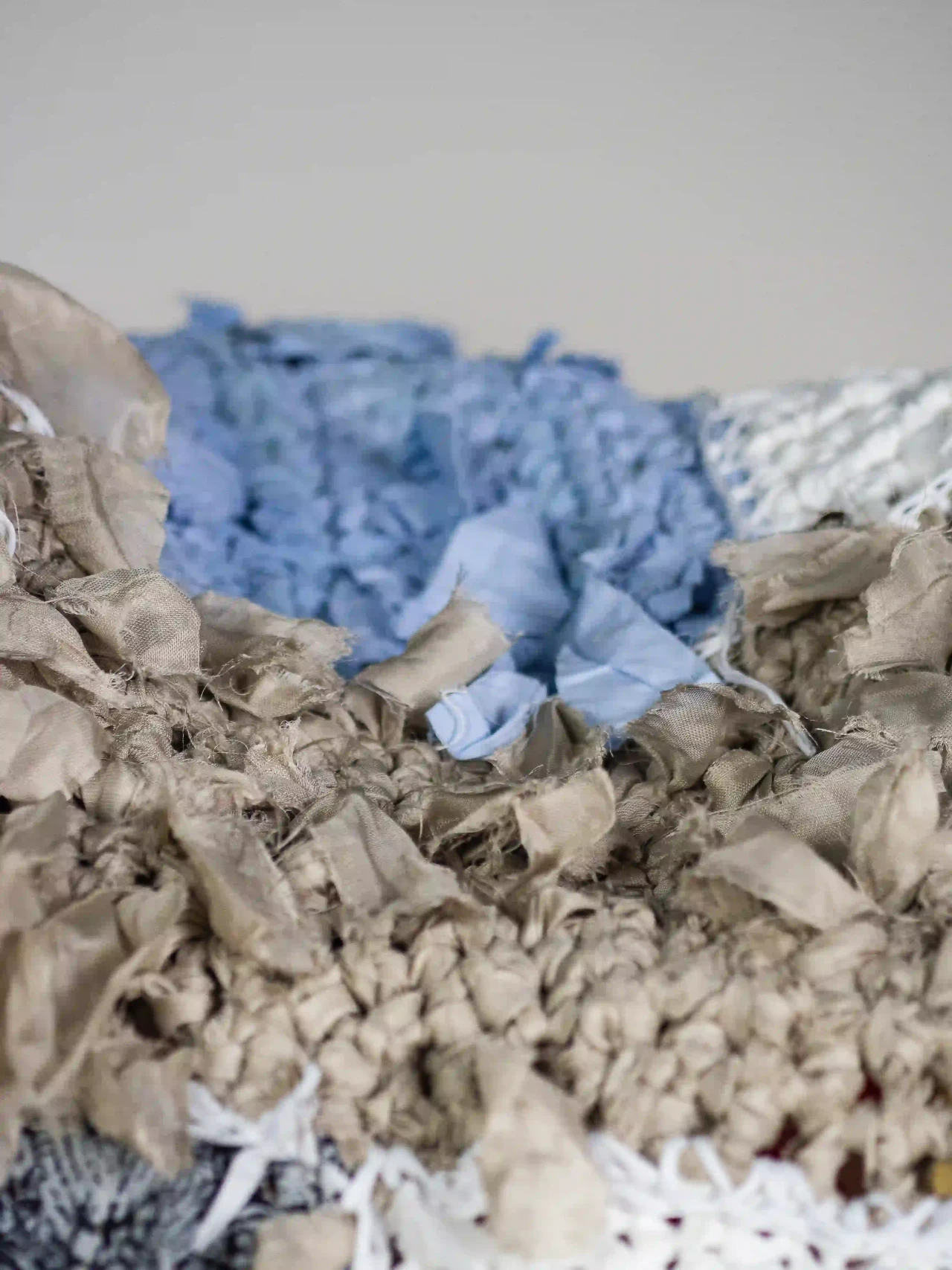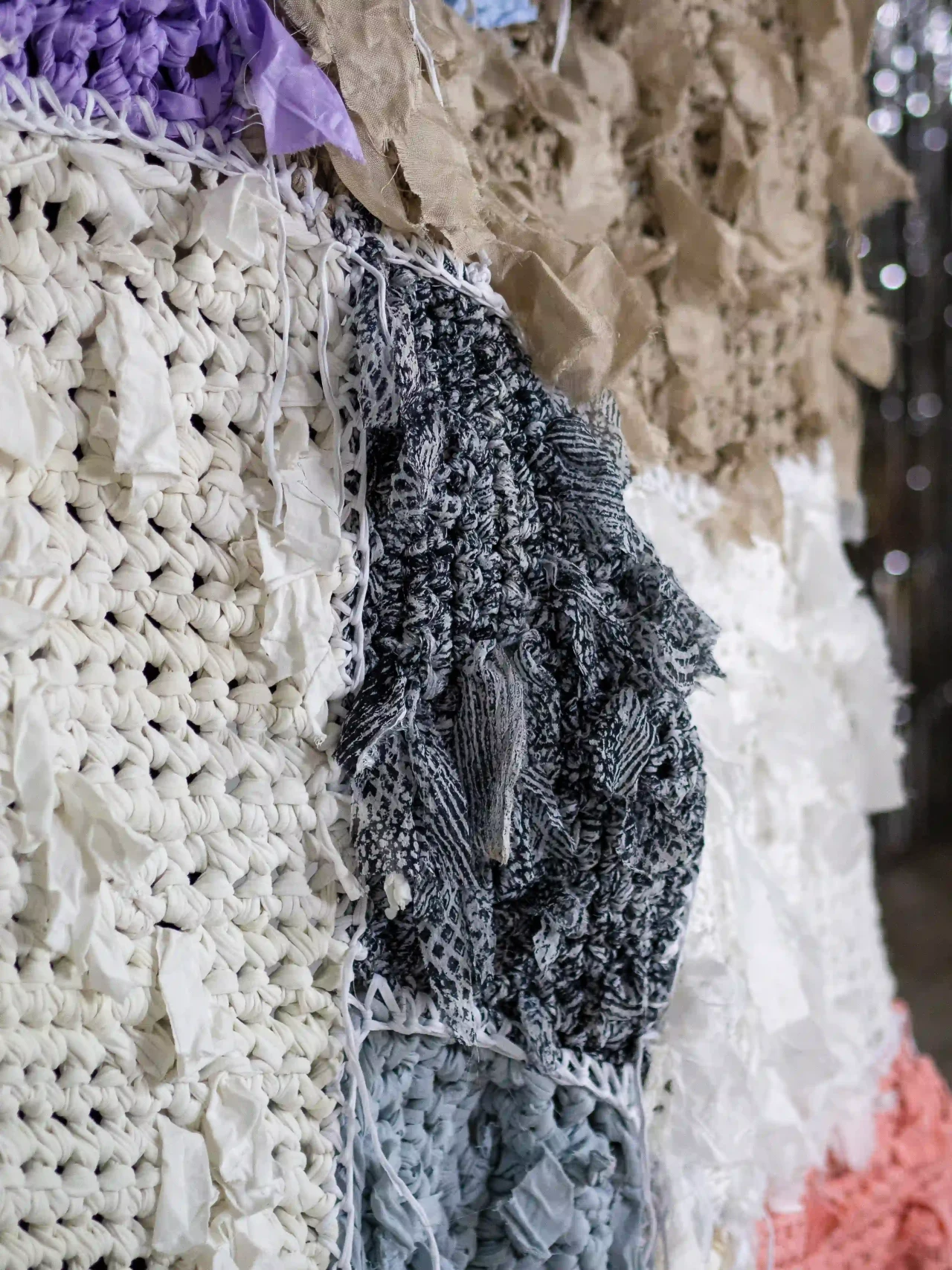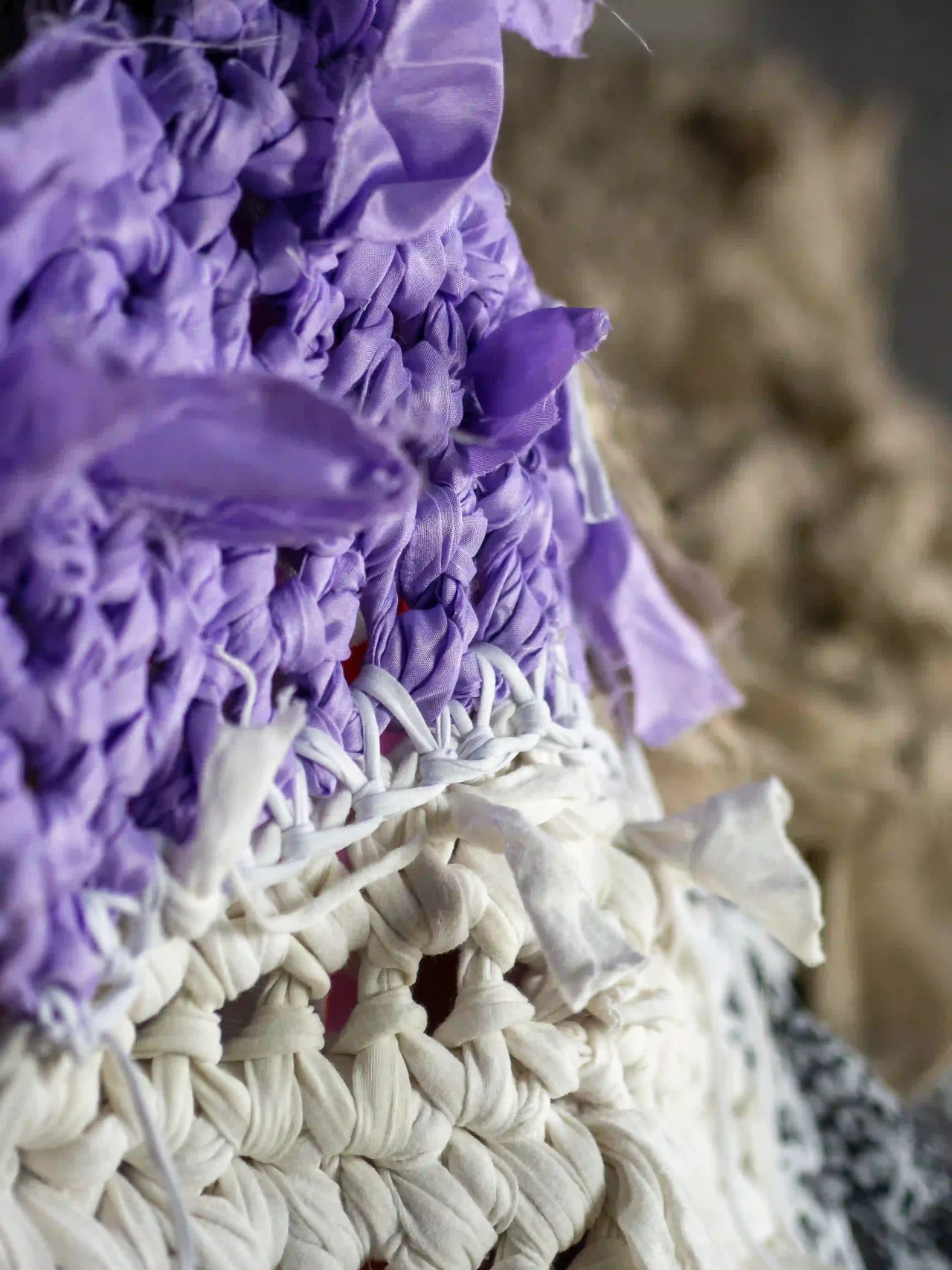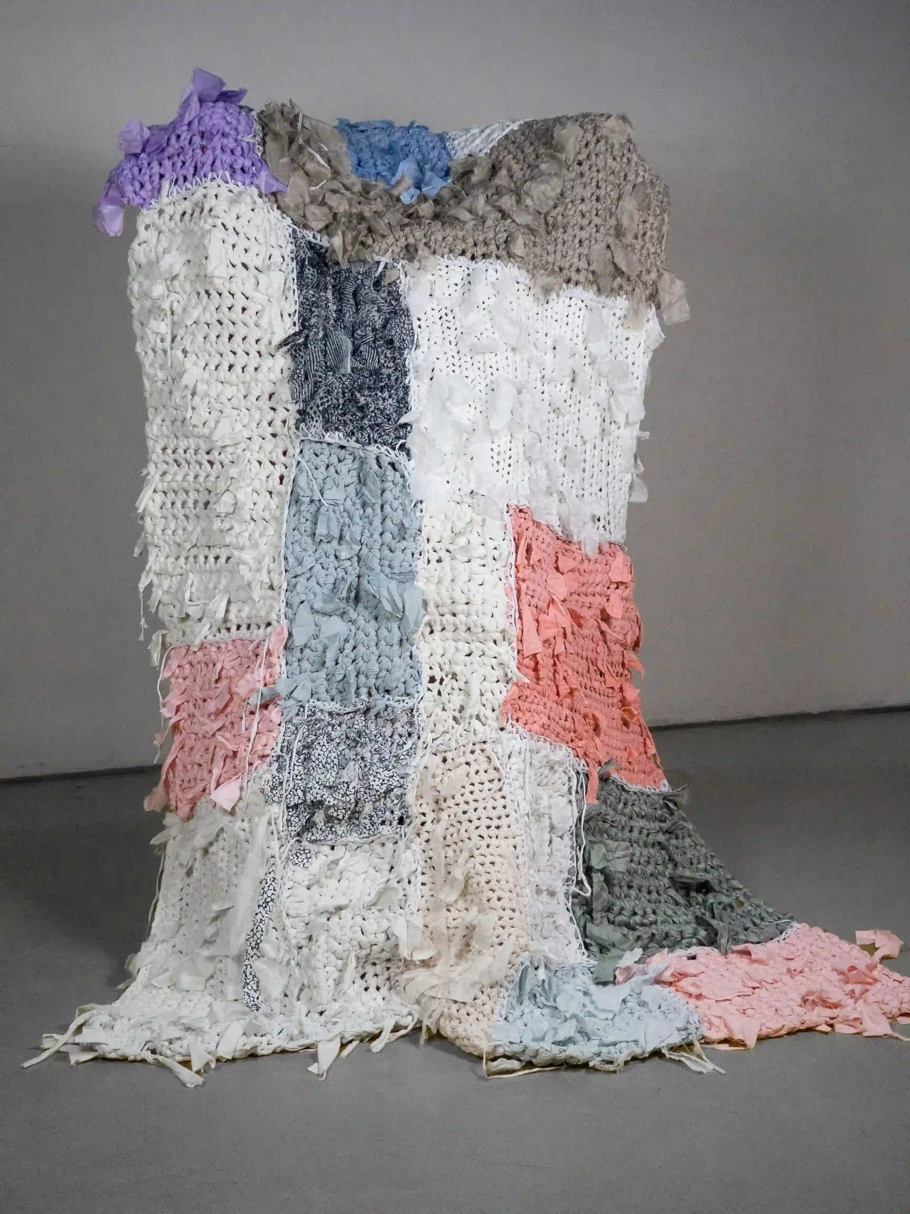 ►Kannst du uns dein Projekt beschreiben? Meine Arbeit umfasst ein Projekt ‹Textile Flächen in Größe› aus einem Textildesignkurs in dem der Fokus auf Größe und Plastizität liegen sollte. Meine Idee war es, Häkeltechniken mit nachhaltigen Materialien zu verknüpfen. ►Möchtest du eine besondere Botschaft oder Bedeutung durch deine Arbeit vermitteln? Das Thema ‹Nachhaltiges Design› ist so aktuell wie nie. So ist es mir wichtig mit meiner Arbeit darauf aufmerksam zu machen, dass Design und Nachhaltigkeit miteinander harmonieren können und gerade textiles Design hier sehr bedeutend sein kann. ►Mit welchen Techniken hast du gearbeitet? Da ich nachhaltige Materialien nutzen wollte, habe ich mich für Upcycling entschieden. Dazu habe ich über die Zeit ‹alltägliche Textilien› gesammelt, wie zum Beispiel Bettlaken, Stoffe, Vorhänge. Im nächsten Schritt habe ich diese Stoffe dann zu unterschiedlich dicken und breiten Streifen zerrissen und miteinander verhäkelt. Um den unterschiedlichen Größen und Breiten der Textilmengen gerecht zu werden, habe ich hier verschieden Häkelnadeln genutzt, die sich in der Stärke unterschieden haben. ►Kannst du uns von deinem Gestaltungsprozess erzählen? Beim Verarbeiten der gesammelten Textilien fand ich es gerade spannend, dass jede Materialität doch eine andere Struktur beim Verarbeiten aufweist. Als ich dann alle verschiedenen Flächen nebeneinandergelegt habe, um sie anschließend miteinander zu verknüpfen, war es besonders schön für mich zu sehen, wie die Gestaltung unterschiedliche Tiefen und Strukturen miteinander zu einer großen Fläche verbunden hat und doch jede einzelne Fläche für sich spricht. ►Was war die größte Herausforderung für dich? Bei der Hälfte der Menge nicht schon beim Verhäkeln aufzugeben. Es waren sehr viele Textilien, die ich gebraucht habe, um auf die angeforderte Fläche zu kommen. Außerdem hat es sehr viel Handkraft gebraucht, um das dicke Textil zu verarbeiten. ►Hast du ein Skizzenbuch? Ja, meistens schon. An dieses Projekt bin ich aber eher frei herangegangen und habe mir die Inspiration von anderen Flächen und Objektdesigns geholt, die ich gestalte. Ansonsten arbeite ich auch sehr gerne mit Moodboards und Collagen. ►Wo findest du Inspiration für deine Arbeiten? Neben Collagen und Moodboards finde ich meine Inspiration in anderen Flächen und Objektdesigns von mir. Ich bin nebenbei freie Künstlerin und wie es auch bei meiner Objekt und Leinwandkunst ist, gehe ich sehr gerne in die Tiefen, arbeite mit Strukturen und Plastizität und gestalte im ‹organischen Stil›. Wie auch bei diesem Textilprojekt. Mich fasziniert es, mit Materialien zu experimentieren und sie anschließen zu etwas Neuem zu gestalten oder rekonstruieren. Dabei besteht Textildesign nicht nur aus dem Design einer textilen Fläche. Es ist vielmehr eine Komposition, von Design und Textil in Objekt und Fläche und kann dabei in alle Arten und Dimensionen gehen. Design mit nachhaltigem Bewusstsein kann gerade bei Textildesign integriert werden. Das war mir bei meiner Arbeit hier besonders wichtig.