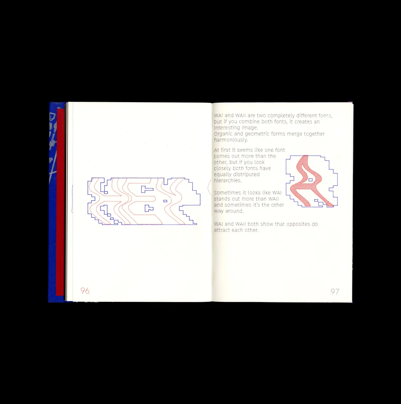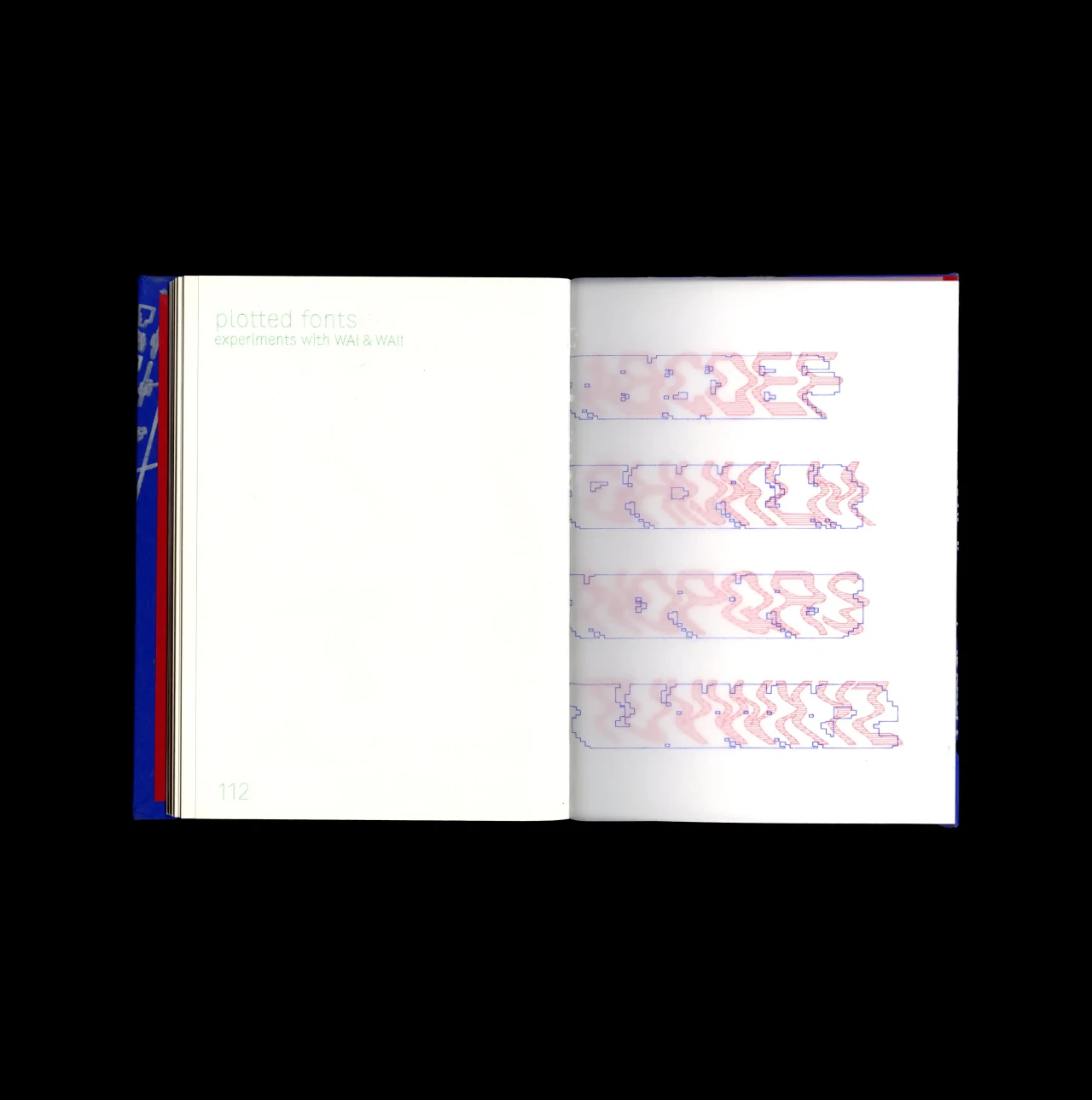 ►Kannst du uns dein Projekt beschreiben? Was ist die Grundidee? Ich zeige mit dem Buch meinen Arbeitsprozess über das gesamte Semester und die drei Schriften, die dabei entstanden sind. Jede Schrift wird mit einer individuellen Stiftfarbe dargestellt, damit man die Varietät des Pen-Plotters erkennen kann. Das Buch orientiert sich chronologisch am Ablauf des Semesters. Die Schrift, die ich zuerst entworfen habe, ist am Anfang des Buches zu sehen, dann kommen verschiedene Experimente, die ich dann mit dem Pen-Plotter gemacht habe und so weiter ... Das Buch soll eher den Prozess zeigen, den ich beim Entwerfen durchlaufen habe, als das fertige Ergebnis. ►Was macht deine Schriften so besonders? Die erste Schrift ‹plancton halfway singleline› wurde einzig und allein mit dem Plancton-Editor erstellt, welcher auf dem Metafont-System basiert. Das heißt, ich habe die Glyphen nicht gezeichnet, so wie mensch es in anderen Schriftprogrammen machen würde, sondern ich habe den ‹Extrempunkten› der Buchstaben einzelne Koordinaten gegeben. Diese wurden vom Editor dann so umgesetzt, dass am Ende ein Buchstabe entsteht. Theoretisch habe ich die einzelnen Glyphen ‹gecodet›. Bei ‹WAI› und ‹WAII› ist die Besonderheit, dass sich, wenn beide Schriften übereinander liegen, ein komplett neues, interessantes Zusammenspiel von organischen und geometrischen Formen ergibt. ‹WAI› vertritt dabei eher die geometrische und statische Seite, ‹WAII› ist dafür eher organisch. Mir war besonders bei ‹WAI› wichtig, dass die Schrift nicht unbedingt leserlich sein muss, da alles, was im Rahmen dieses Kurses und im Rahmen meines Buches passiert ist, sehr experimentell war. Ich persönlich finde, dass Design nicht immer eindeutig zeigen muss, was es sagen will. Manchmal geht es auch einfach darum, den Prozess dahinter zu zeigen und sich mit der Arbeitsweise und nicht mit dem Ergebnis zu beschäftigen. Der*die Betrachter*in muss selbst Interpretieren und sich darüber Gedanken machen können, was er*sie gerade sieht. ►Warum hast du den Pen-Plotter als Tool gewählt? Weil er so viel mehr Möglichkeiten bietet, als das Digitaldruckverfahren. Du kannst dir dein Papier selbst auswählen, auf das du plotten möchtest, du kannst dir deinen Stift selber aussuchen, mit dem du plotten möchtest ... Du hast die komplette Entscheidungsfreiheit vom Design- und Entwurfsprozess bis hin zum Drucken selbst. Außerdem ist das Drucken mit dem Pen-Plotter sehr viel billiger, da ich einfach nur Papier und Stifte von mir brauchte, dann konnte ich loslegen. Ich wollte mich challengen, ein Buch von Anfang bis Ende komplett selbst zu gestalten. Meistens wird der Druck und das Binden von externen Druckereien oder Buchbindereien übernommen, und das wollte ich nicht. Ich wollte ein kleines Buch über meinen Arbeitsprozess und über meine entstandenen Dinge aus dem Kurs erstellen, welches auch kleine Imperfektionen aufweist. Ein Buch, was komplett von mir kommt, bei dem es stimmt, wenn ich sage: «Das alles habe ich allein gemacht!» Natürlich ist nicht alles perfekt, aber darum geht es mir auch. Manchmal ist eben eine Seitenzahl nicht zu hundert Prozent zu sehen, da der Stift an der Stelle zu weit weg vom Papier war, oder manchmal sind Buchstaben verbunden, die eigentlich nicht verbunden sein sollten, weil der Stift zu nah am Papier war. Ich fand es einfach supersatisfying, dem Pen-Plotter bei seiner Arbeit zuzuschauen. Vorbeigehende meinten auch oft, das Geräusch des Plotters sei sehr interessant. ►Was macht den Pen-Plotter für dich so spannend? Genau das, was ich oben schon beschrieben habe: Mensch weiß nie, was herauskommt und muss auch mit kleinen Fehlern rechnen. Und die Vielfalt, die diese kleine Maschine zeigt, nur wenn man einen anderen Stift benutzt, oder die Schnelligkeit der Maschine verändert ... Generell fand ich es superinteressant, mit verschiedenen Modi, Papieren und Stiften den Pen-Plotter an seine Grenzen zu bringen und auszutesten. ►Wo würdest du deine Schriften gern einmal sehen? ‹WAI› und ‹WAII› würde ich tatsächlich gerne mal auf einem großen Editorial-Plakat sehen. Ich finde es auch toll, wenn nur einzelne Glyphen als Kunst angesehen werden und diese irgendwo groß gezeigt oder gemalt werden. Gerade ‹WAI› hat das Potenzial dazu nicht nur als Schrift, sondern auch als einzelnes abstraktes Kunststück gesehen zu werden. ►Welche Rolle spielt das Experimentieren in deinem Arbeitsprozess? Eine sehr große ... eigentlich sogar die wichtigste. Ohne Experimentieren kommt man doch gar nicht erst auf Ideen, die einen weiterbringen. Für mich ist Experimentieren die schönste Sache im Designprozess. Ich bin eine Person, die viel ausprobiert und mit verschiedensten Materialien arbeitet. Genau das macht mir auch am meisten Spaß am Designerin-Sein.