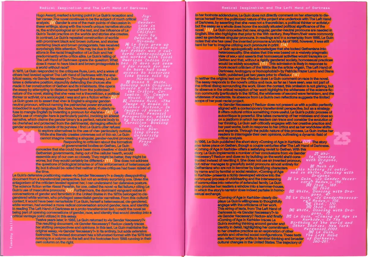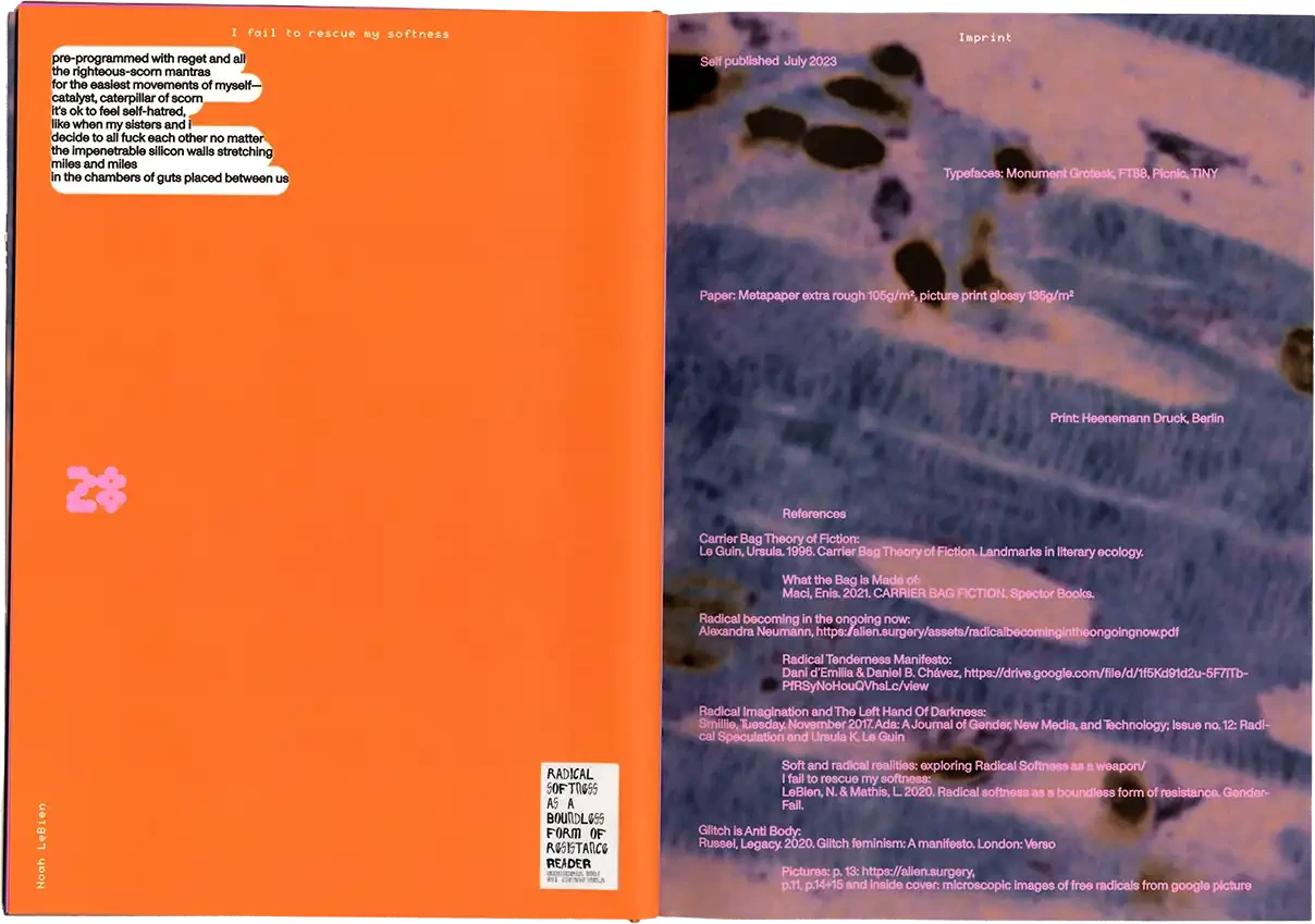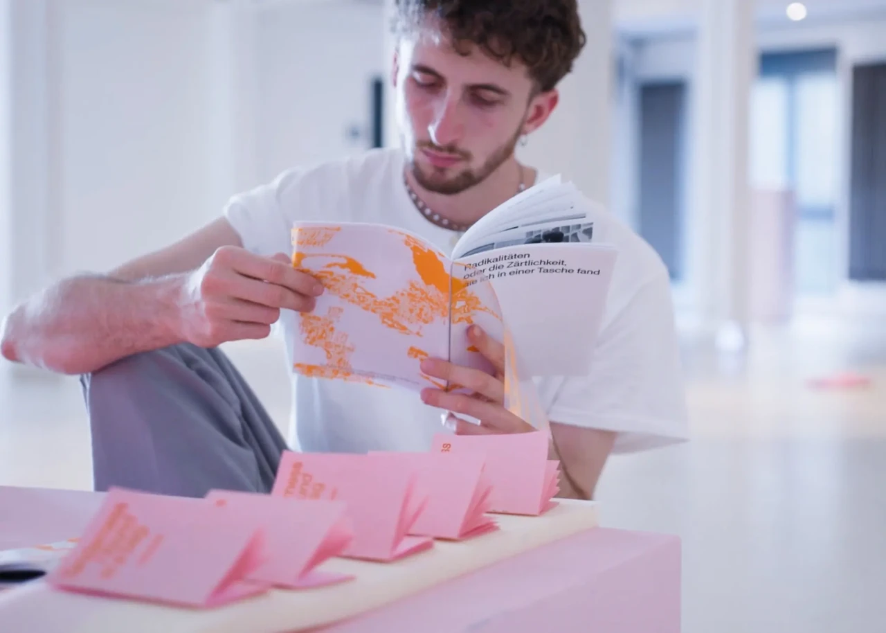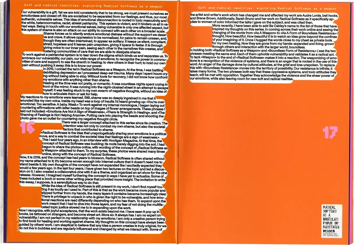 ►Kannst du dich und dein Projekt kurz vorstellen? In meiner Abschlussarbeit habe ich Formen der Radikalität untersucht und plädiere hierbei für ein breites Narrativ, da Radikalität zu oft in den Kontext von Gewalt oder Krisen gesetzt wird. Wir brauchen meiner Meinung nach aber Radikalität, um eine bessere Gesellschaft zu werden*. In meiner Arbeit wird Perspektiven Raum gegeben, die einen radikalen Ansatz in ihrem Schaffen verfolgen. Sie ist eine Sammlung von Texten, Farben, Haptik und Sound und bildet eine persönliche Darstellung von Radikalität in künstlerischer Form. Die Art, wie wir kommunizieren, erzählen und gestalten, kann ein erster Ansatz für die Veränderung eines Zustands in der Gesellschaft sein, weshalb wir uns radikal mit Verhältnissen auseinandersetzen müssen, was ich sowohl privat als auch in meiner gestalterischen Arbeit tue. ►Der Name lässt Raum für Fragen. Kannst du erzählen, wie du darauf gekommen bist? Und vielleicht auch was er für dich bedeutet? Der Titel der Arbeit kommt vor allem aus meinem theoretischen Teil. Für mich war das Erarbeiten der Theorie sehr bedeutsam. Da ich mich der Radikalität und vor allem der Radikalen Zärtlichkeit gewidmet habe, kommt dies auch im Titel vor. Ich spanne innerhalb der Arbeit den Bogen zur mittlerweile [zum Glück] ‹trending carrier bag of theory of fiction›, in der es heruntergebrochen ums Sammeln und um antipatriarchales [Geschichten-] Erzählen geht. Dieser Ansatz geht für mich eben auch mit dem Konzept der radikalen Zärtlichkeit einher, weil es hier vor allem darum geht, den rassistischen und kapitalistischen Status quo unserer Gesellschaft zu überwinden. Dieser fußt, wie wir ja alle wissen auf dem Patriarchat. Die Tragetaschentheorie kommt also auch im Titel vor. ►Kannst du uns einen Einblick in deinen Gestaltungsprozess geben? Wie bist du vorgegangen? Wie gesagt, ich habe mich vorangehend eher mit der Theorie beschäftig und dann kam sehr intuitiv ein visuelles Konzept in Farben, Formen und Stofflichkeiten dazu. Ich wollte räumlich arbeiten und habe versucht einen Ort zu schaffen, an dem Besucher*innen beobachten könnten, ohne lediglich konsumieren zu müssen. Ich wusste bis zum Tag vor der Prüfung nicht, wie alles letztendlich im Raum aussehen würde, weshalb ich flexibel denken musste. Ein Netz, was begehbar ist als Anlehnung an die Carrier Bag. Die Kissen symbolisieren Körper, weil diese grundlegend für Radikalität sind. Jeder Gegenstand der Installation hat einen metaphorischen Bezug zur Theorie. Der Reader und die Audiovisionen waren mir wichtig als ein Format, welches Wissen und Gedanken in textlicher Form enthält. Die gesammelten Texte darin haben mich teilweise auch bei der Gestaltung inspiriert. Das Mini-Manifesto kam zum Schluss dazu und ist meine persönliche Schlussfolgerung aus der Theorie, wo ein radikal zärtlicher Ansatz nochmals festgehalten wird. Während der Ausstellung gab es auch Sound, der passend zum Konzept komponiert war. Das war für die räumliche Atmosphäre auch noch mal wichtig. ►Mit welchen Techniken hast du gearbeitet? Ich habe vor allem gelesen und es war total schön, sich so tiefgreifend mit einem Thema auseinandersetzen zu können. Ich habe auch genäht, gefärbt, kleine Skulpturen gemacht. Für die Printsachen hab ich gesiebdruckt und riso-gedruckt und mir eine Bindung überlegt, die zum Konzept passt. Eine Freundin hat manche Texte eingelesen, falls man nicht lesen will oder kann. Es war viel Trial-and-Error, aber insgesamt hat mir das Arbeiten an dem Projekt viel Spaß gebracht. ►Wer hat dich inspiriert? Die, die sich mit radikalen Ansätzen für eine bessere Gesellschaft auseinandersetzen und das in textlicher oder visueller Form festhalten. Die Autor*innen, die ich im Reader gesammelt habe, Seyda Kurt, der Cyber Feminism Index und Freund*innen, die sich mit ähnlichen Themen beschäftigen. ►Was fühlst du, wenn du auf dein Projekt schaust oder an dein Projekt denkst? Erstmal fühle ich eine Art Nostalgie, weil mit diesem Projekt mein erstes Studium und damit prägende Jahre zu Ende gingen. Ich hab die Arbeit an so einem intensiven Projekt sehr genossen und denke gern an die Bachelormonate zurück. Wobei die Arbeit an dem Thema damit nicht abgeschlossen ist, das sind ja oft auch Lebensthemen, mit denen man sich da beschäftigt. Ich merke auch immer erst in so Momenten, wenn ich darüber schreibe oder spreche – wie jetzt gerade –, was alles dahinter steckt und was man von außen betrachtet vielleicht erstmal gar nicht wahrnimmt. ►Was ist dir besonders wichtig an deinem Projekt? Mir ist wichtig, dass wenn wir uns als Designer*innen oder Künstler*innen politischen Themen widmen, dabei authentisch bleiben müssen. Das heißt für mich auch, sich nicht politischen Verhältnissen bedienen und daraus oder damit Gestaltung machen. Politisch zu sein muss beim Menschen anfangen, nicht erst bei der Gestaltung. Meine Arbeit ist auch nicht in-your-face-politisch, im ersten Moment ist sie einfach schön anzusehen. Aber da es ein sehr persönliches, bedachtes Projekt ist, finde ich das okay. Ich wollte zärtlich zu mir und meinem Gestaltungsprozess sein und hab daher auch etwas Abstand genommen zu den typischen Methoden, die ich bisher im Studium erlernt habe.