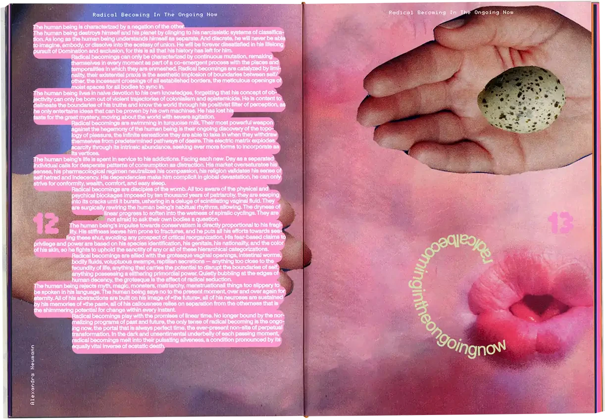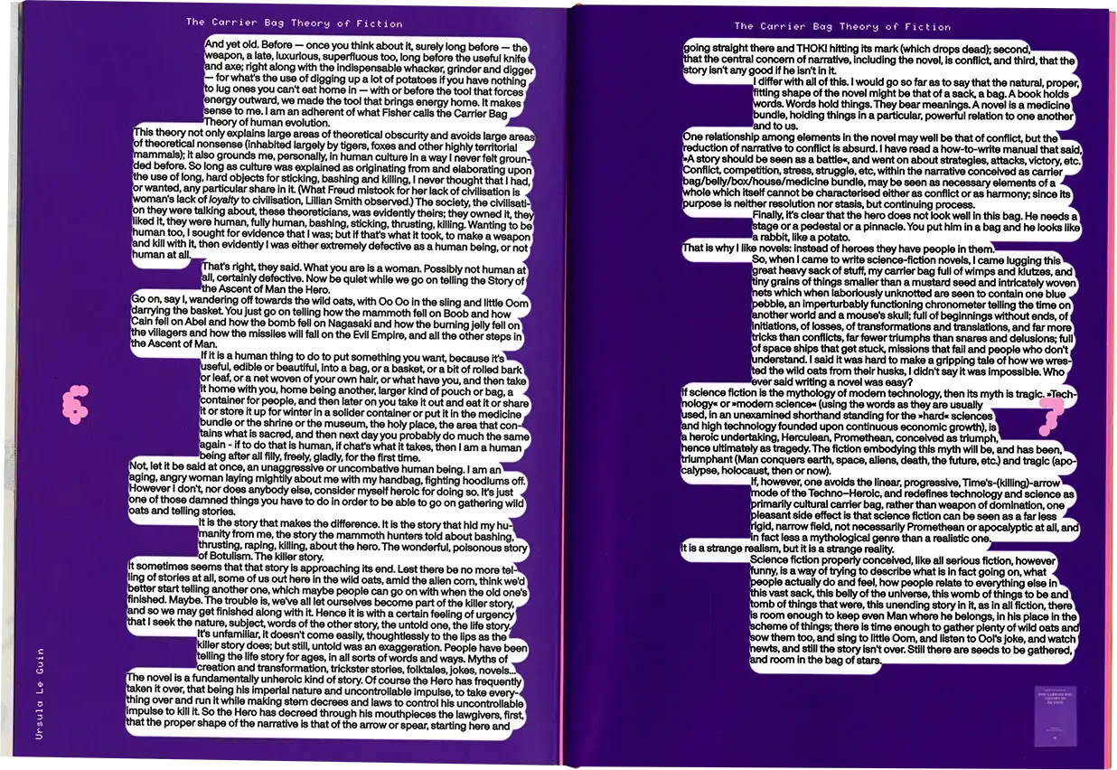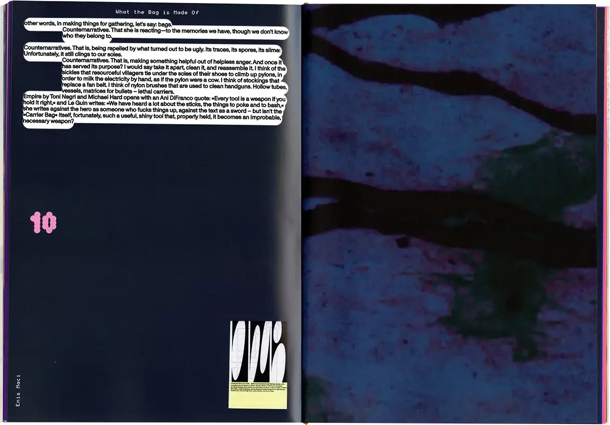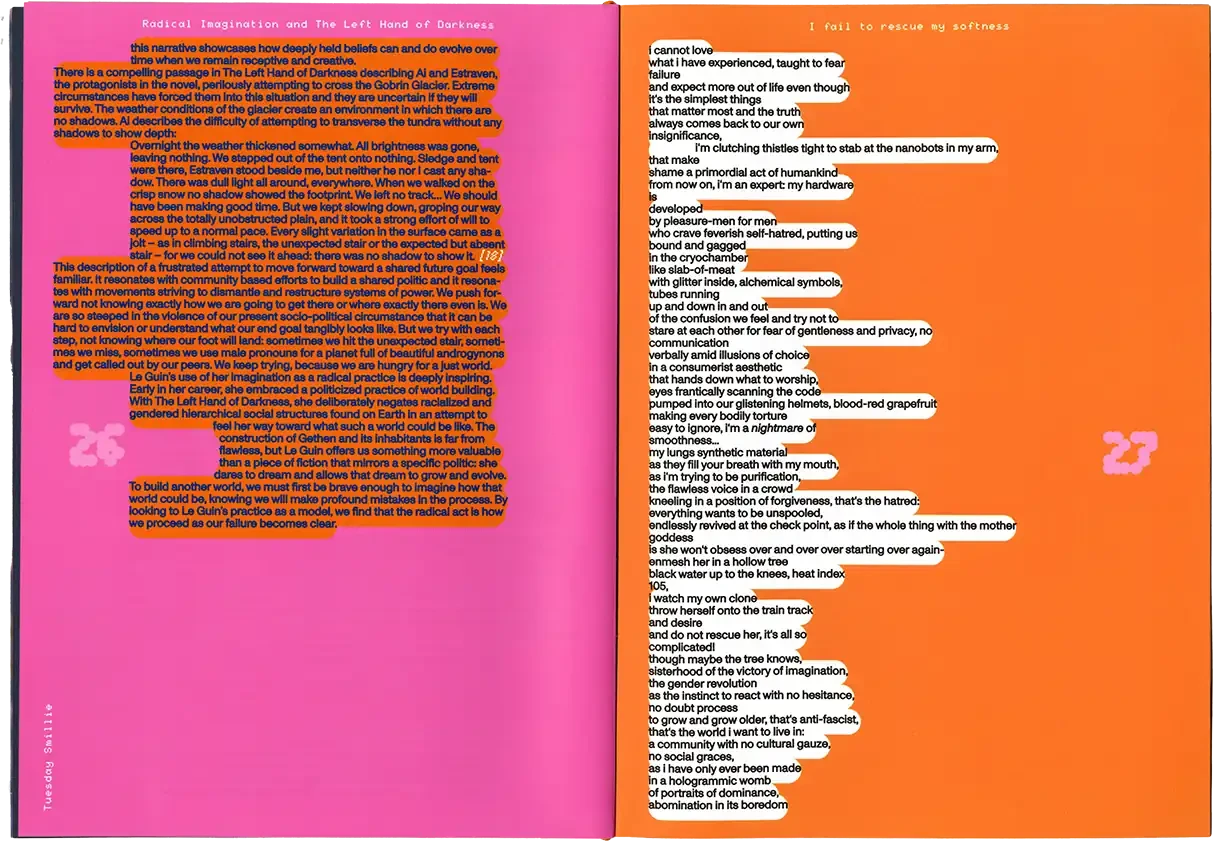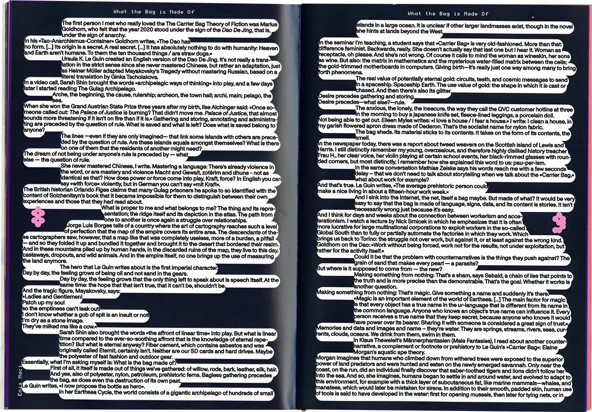 ►Kannst du dich und dein Projekt kurz vorstellen? In meiner Abschlussarbeit habe ich Formen der Radikalität untersucht und plädiere hierbei für ein breites Narrativ, da Radikalität zu oft in den Kontext von Gewalt oder Krisen gesetzt wird. Wir brauchen meiner Meinung nach aber Radikalität, um eine bessere Gesellschaft zu werden*. In meiner Arbeit wird Perspektiven Raum gegeben, die einen radikalen Ansatz in ihrem Schaffen verfolgen. Sie ist eine Sammlung von Texten, Farben, Haptik und Sound und bildet eine persönliche Darstellung von Radikalität in künstlerischer Form. Die Art, wie wir kommunizieren, erzählen und gestalten, kann ein erster Ansatz für die Veränderung eines Zustands in der Gesellschaft sein, weshalb wir uns radikal mit Verhältnissen auseinandersetzen müssen, was ich sowohl privat als auch in meiner gestalterischen Arbeit tue. ►Der Name lässt Raum für Fragen. Kannst du erzählen, wie du darauf gekommen bist? Und vielleicht auch was er für dich bedeutet? Der Titel der Arbeit kommt vor allem aus meinem theoretischen Teil. Für mich war das Erarbeiten der Theorie sehr bedeutsam. Da ich mich der Radikalität und vor allem der Radikalen Zärtlichkeit gewidmet habe, kommt dies auch im Titel vor. Ich spanne innerhalb der Arbeit den Bogen zur mittlerweile [zum Glück] ‹trending carrier bag of theory of fiction›, in der es heruntergebrochen ums Sammeln und um antipatriarchales [Geschichten-] Erzählen geht. Dieser Ansatz geht für mich eben auch mit dem Konzept der radikalen Zärtlichkeit einher, weil es hier vor allem darum geht, den rassistischen und kapitalistischen Status quo unserer Gesellschaft zu überwinden. Dieser fußt, wie wir ja alle wissen auf dem Patriarchat. Die Tragetaschentheorie kommt also auch im Titel vor. ►Kannst du uns einen Einblick in deinen Gestaltungsprozess geben? Wie bist du vorgegangen? Wie gesagt, ich habe mich vorangehend eher mit der Theorie beschäftig und dann kam sehr intuitiv ein visuelles Konzept in Farben, Formen und Stofflichkeiten dazu. Ich wollte räumlich arbeiten und habe versucht einen Ort zu schaffen, an dem Besucher*innen beobachten könnten, ohne lediglich konsumieren zu müssen. Ich wusste bis zum Tag vor der Prüfung nicht, wie alles letztendlich im Raum aussehen würde, weshalb ich flexibel denken musste. Ein Netz, was begehbar ist als Anlehnung an die Carrier Bag. Die Kissen symbolisieren Körper, weil diese grundlegend für Radikalität sind. Jeder Gegenstand der Installation hat einen metaphorischen Bezug zur Theorie. Der Reader und die Audiovisionen waren mir wichtig als ein Format, welches Wissen und Gedanken in textlicher Form enthält. Die gesammelten Texte darin haben mich teilweise auch bei der Gestaltung inspiriert. Das Mini-Manifesto kam zum Schluss dazu und ist meine persönliche Schlussfolgerung aus der Theorie, wo ein radikal zärtlicher Ansatz nochmals festgehalten wird. Während der Ausstellung gab es auch Sound, der passend zum Konzept komponiert war. Das war für die räumliche Atmosphäre auch noch mal wichtig. ►Mit welchen Techniken hast du gearbeitet? Ich habe vor allem gelesen und es war total schön, sich so tiefgreifend mit einem Thema auseinandersetzen zu können. Ich habe auch genäht, gefärbt, kleine Skulpturen gemacht. Für die Printsachen hab ich gesiebdruckt und riso-gedruckt und mir eine Bindung überlegt, die zum Konzept passt. Eine Freundin hat manche Texte eingelesen, falls man nicht lesen will oder kann. Es war viel Trial-and-Error, aber insgesamt hat mir das Arbeiten an dem Projekt viel Spaß gebracht. ►Wer hat dich inspiriert? Die, die sich mit radikalen Ansätzen für eine bessere Gesellschaft auseinandersetzen und das in textlicher oder visueller Form festhalten. Die Autor*innen, die ich im Reader gesammelt habe, Seyda Kurt, der Cyber Feminism Index und Freund*innen, die sich mit ähnlichen Themen beschäftigen. ►Was fühlst du, wenn du auf dein Projekt schaust oder an dein Projekt denkst? Erstmal fühle ich eine Art Nostalgie, weil mit diesem Projekt mein erstes Studium und damit prägende Jahre zu Ende gingen. Ich hab die Arbeit an so einem intensiven Projekt sehr genossen und denke gern an die Bachelormonate zurück. Wobei die Arbeit an dem Thema damit nicht abgeschlossen ist, das sind ja oft auch Lebensthemen, mit denen man sich da beschäftigt. Ich merke auch immer erst in so Momenten, wenn ich darüber schreibe oder spreche – wie jetzt gerade –, was alles dahinter steckt und was man von außen betrachtet vielleicht erstmal gar nicht wahrnimmt. ►Was ist dir besonders wichtig an deinem Projekt? Mir ist wichtig, dass wenn wir uns als Designer*innen oder Künstler*innen politischen Themen widmen, dabei authentisch bleiben müssen. Das heißt für mich auch, sich nicht politischen Verhältnissen bedienen und daraus oder damit Gestaltung machen. Politisch zu sein muss beim Menschen anfangen, nicht erst bei der Gestaltung. Meine Arbeit ist auch nicht in-your-face-politisch, im ersten Moment ist sie einfach schön anzusehen. Aber da es ein sehr persönliches, bedachtes Projekt ist, finde ich das okay. Ich wollte zärtlich zu mir und meinem Gestaltungsprozess sein und hab daher auch etwas Abstand genommen zu den typischen Methoden, die ich bisher im Studium erlernt habe.