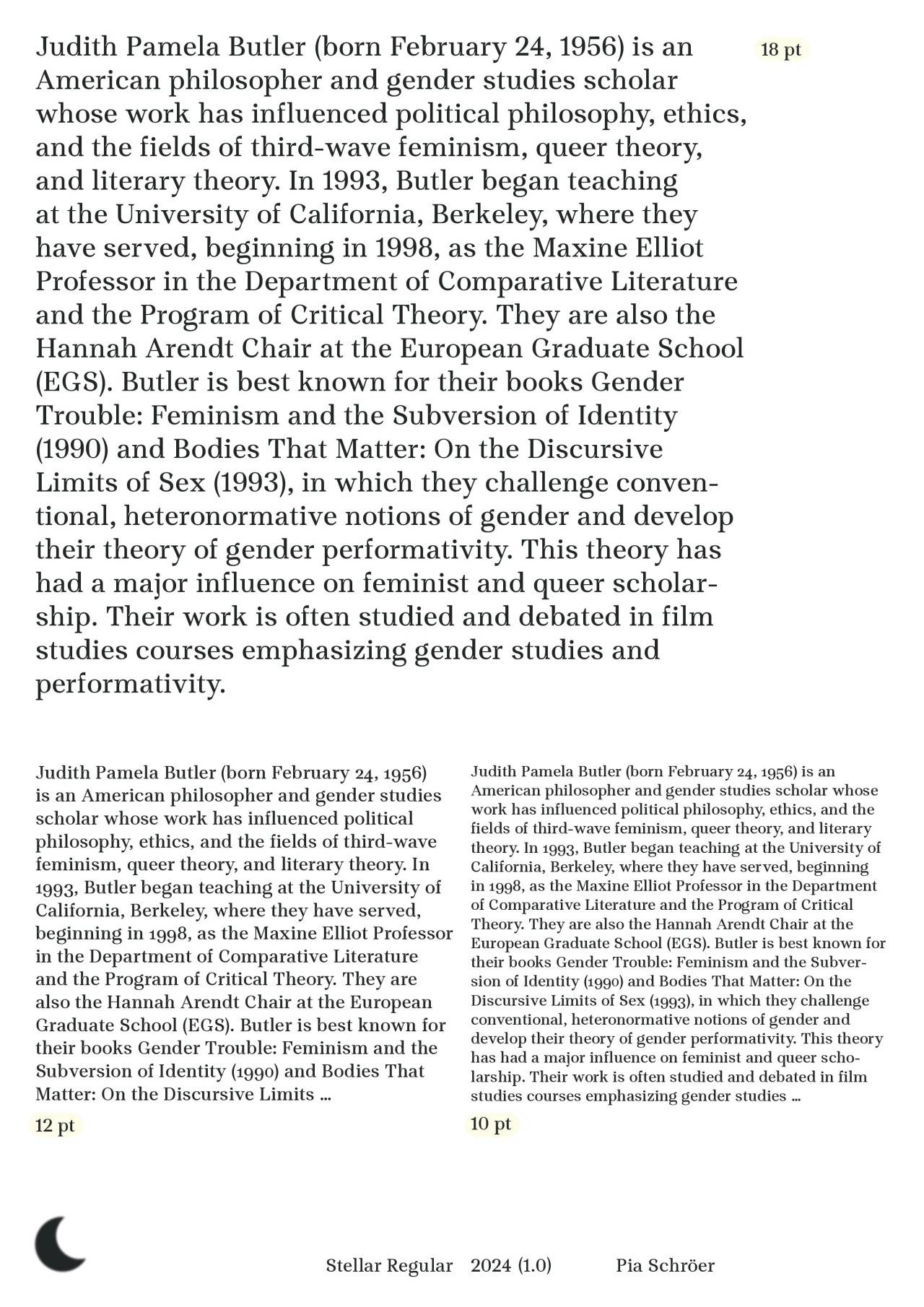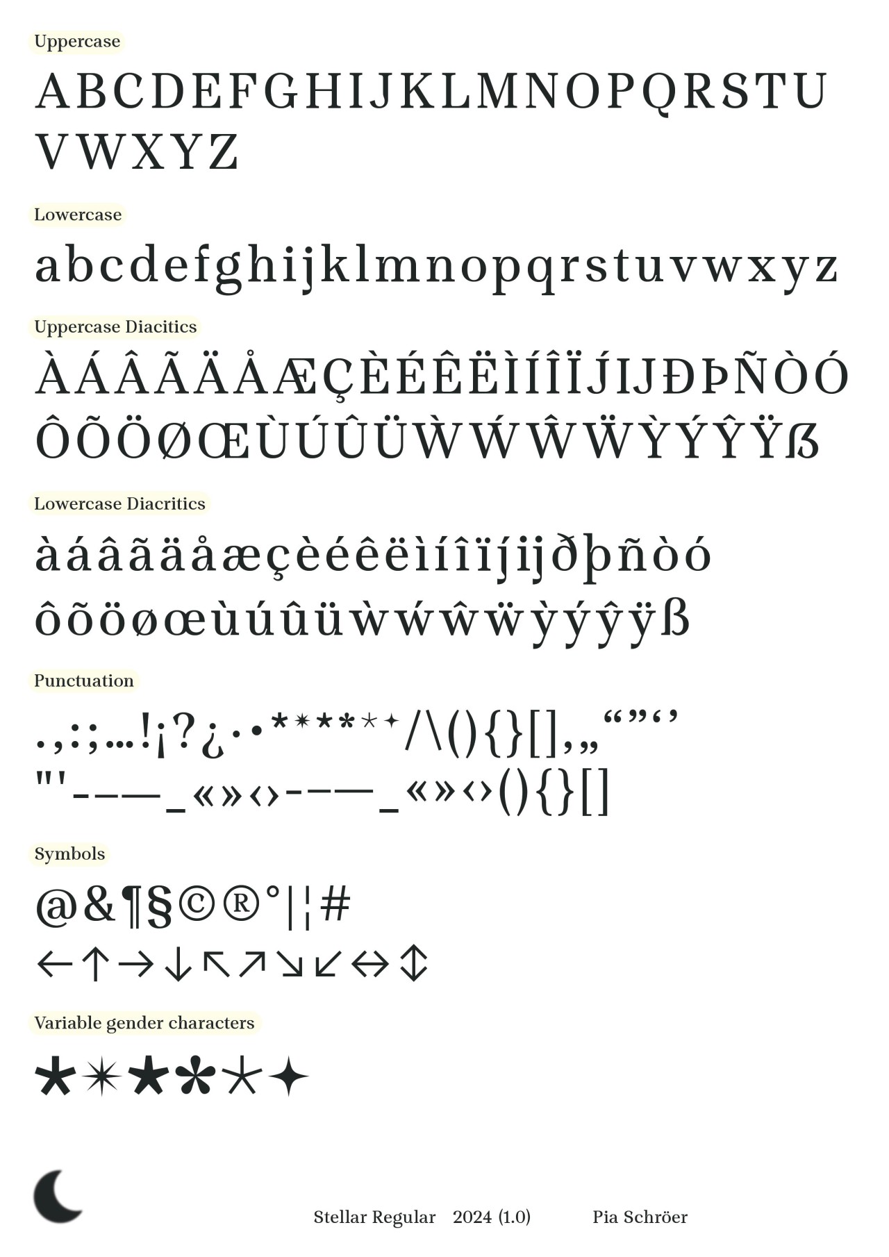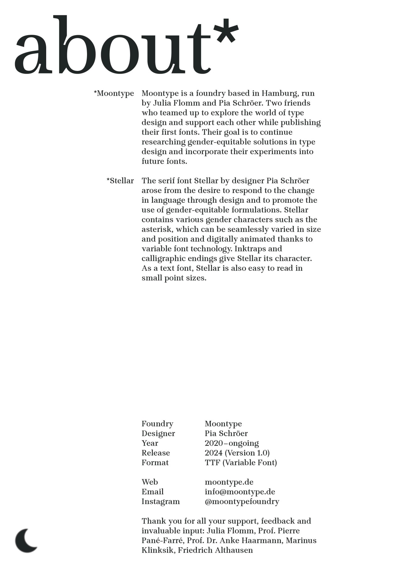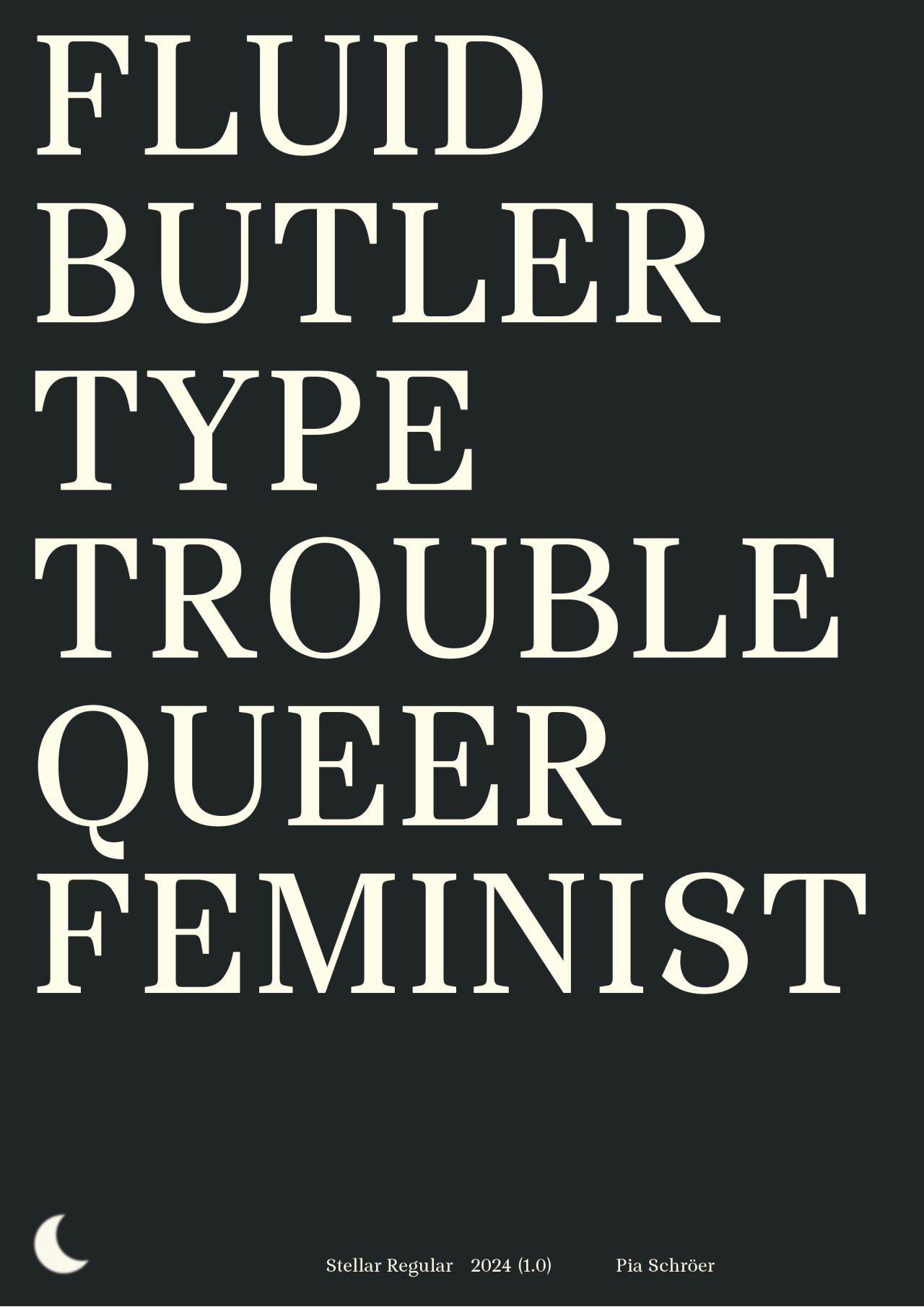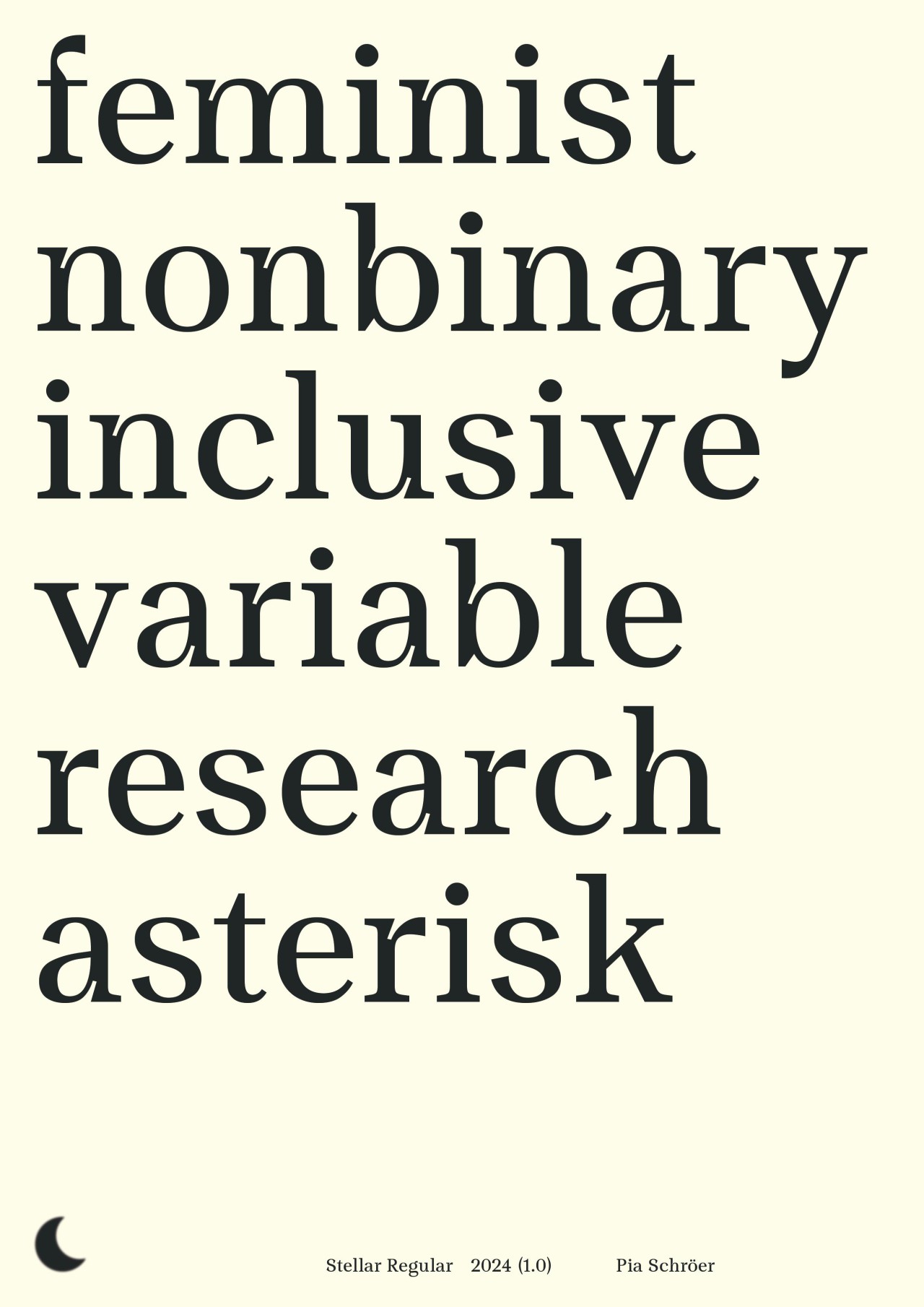 ►Kannst du dich und deine Schrift vorstellen? Mein Name ist Pia Schröer, ich wohne in Hamburg und habe von 2013 bis 2023 an der HAW Design im Bachelor und Master studiert. Momentan arbeite ich in einem kleinen Designbüro und in der restlichen Zeit als freiberufliche Designerin. Neben Type Design liegen meine Schwerpunkte in der Gestaltung visueller Identitäten sowie im Buch- und Editorialdesign. Die Schrift Stellar ist das Ergebnis meiner Masterarbeit ‹Type Trouble. Gendersensible Schriftgestaltung›. Derzeit enthält die Serifenschrift verschiedene Gendersterne, die dank der Variable-Font-Technologie stufenlos in Größe und Position variiert werden können und somit digital leicht animierbar sind. Inktraps und kalligrafische Abschlüsse verleihen Stellar ihren Charakter. Als Textschrift konzipiert, ist sie auch in kleinen Punktgrößen gut lesbar. Für die Zukunft sind weitere Gender–Zeichen und Schriftschnitte geplant. Zusammen mit der Designerin Julia Flomm habe ich ‹Moontype Foundry› gegründet. Dort veröffentlichen wir unsere Schriften und forschen gemeinsam an neuen Möglichkeiten gendersensibler Schriftgestaltung. ►Was hat dich dazu inspiriert, diese Schrift zu entwickeln? In der deutschen Sprache gibt es bis heute keine adäquate Personenbezeichnung für Menschen, die sich zwischen oder jenseits der binären Geschlechtsidentitäten verorten. Um dieser Ungleichheit in der Sprache entgegenzuwirken und sie inklusiv zu gestalten, entwickeln bereits viele Initiativen und Communities neue Grammatiken und Vorschläge für einen geschlechtersensiblen Sprachgebrauch, die über die derzeit gängigen Methoden des Genderns hinausgehen. Mit dem stetigen Wandel der Sprache muss sich auch die Schriftgestaltung auseinandersetzen. Mit der Gestaltung von Stellar sehe ich die Chance auf den Sprachwandel zu reagieren und die Verwendung geschlechtergerechter Formulierungen zu fördern. Stellar verstehe ich als Forschungsobjekt, das Normen hinterfragt, sie dekonstruiert und sich ständig verändert und weiterentwickelt. ►Wie bist du im Gestaltungsprozess vorgegangen? Beginnend 2021 mit Skizzen auf Papier bin ich relativ schnell zur digitalen Gestaltung am Computer übergegangen. Mit Abschluss der Masterarbeit im Februar 2023 stand dann das Konzept für Stellar. Dazwischen hieß es immer wieder ausdrucken, genau hinsehen, hinterfragen und verbessern. Seit dem Masterabschluss habe ich, soweit es die freie Zeit zuließ, an den Feinheiten gearbeitet und fehlende Glyphen gestaltet. Seit Juli 2024 ist die erste Version von Stellar verfügbar. ►Was waren Hürden, die dir während des Projektes begegnet sind? Die Hürde ins Type Design einzusteigen ist oft sehr groß, da viele Texte und Positionen anderer Gestalter*innen nach dem vermeintlich ‹einen› fehlerfreien Schriftbild und der perfekten Lesbarkeit streben. Daher war ich zu Beginn des Gestaltungsprozesses sehr unsicher und habe versucht, nichts ‹falsch› zu machen. Nach Gesprächen mit Professor*innen und Kommiliton*innen wurde ich immer sicherer in meiner Gestaltung und konnte für mich selbst definieren, was ich mit Stellar ausdrücken möchte, nämlich dass Schriftgestaltung auch aus historisch gewachsenen Mustern und Vorgaben ausbrechen und sich neu erfinden darf.