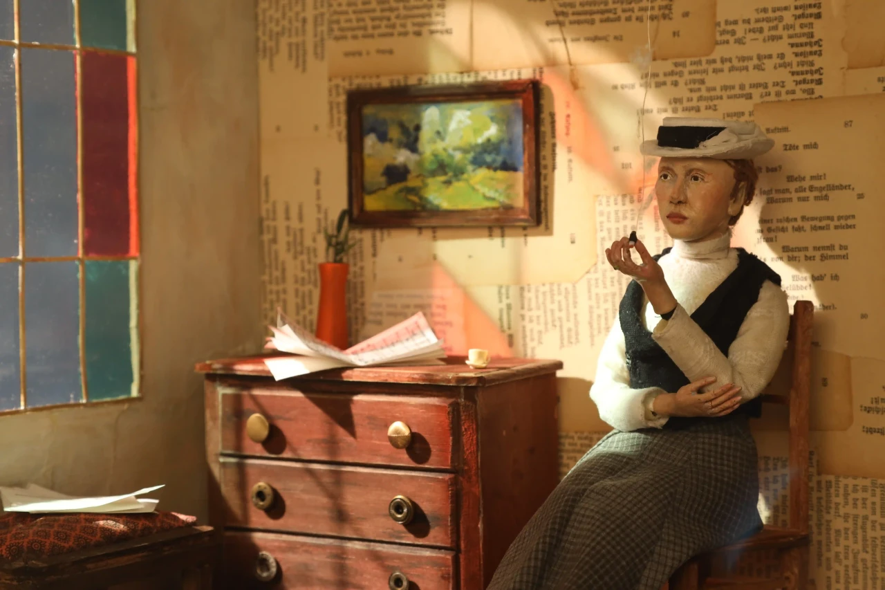 ►Mit welchem Thema hast du dich in deinem Projekt befasst? Ich habe mich in meinem Stop-Motion-Kurzfilmprojekt mit der Autorin Annette Kolb beschäftigt. Angefangen hat alles mit dem Kurs ‹Das Portrait im Puppenbau›. In dem Kurs sollten wir uns für den 90. Jahrestag der Bücherverbrennung eine*n Autor*in aussuchen, die damals von den Nationalsozialisten auf die schwarze Liste gesetzt oder deren Werke verbrannt wurden und ein Portrait in der Form einer Puppe anfertigen. ►Wer war Annette Kolb? Annette Kolb [1870 –1967] war eine deutsch-französische Autorin und Pazifistin. Kolb positionierte sich öffentlich gegen die Kriegsverherrlichung, radikalen Nationalismus und Antisemitismus. Besonders bekannt wurde Annette Kolb für ihre Werke, die oft gesellschaftliche und politische Themen behandelten. Ihr Roman ‹Die Schaukel› aus dem Jahr 1919 ist ein Beispiel für ihr literarisches Schaffen, das auch ihre pazifistische Haltung widerspiegelte. Sie war zudem eine der ersten Frauen, die in Deutschland eine öffentliche politische Meinung vertrat und sich für die Frauenbewegung einsetzte. Nachdem die Nationalsozialisten 1933 die Macht in Deutschland übernommen hatten, wurde Annette Kolb aufgrund ihrer politischen Überzeugungen verfolgt. Sie floh aus Deutschland nach Paris, dann nach New York. Sie starb mit 97 in München. Sämtliche Schriften Annette Kolbs wurden von den Nazis auf die ‹Liste des schädlichen und unerwünschten Schrifttums› gesetzt. ►Kannst du deinen Arbeitsprozess beschreiben? Angefangen habe ich mit dem Bau der Puppe. Dafür habe ich einen Umriss der Körperform auf ein DIN-A3-Blatt gezeichnet. Also einen Entwurf, wie die Puppe aussehen soll. Um das Skelett zu bauen, habe ich Aluminiumdraht genommen und ihn um sich selbst gezwirbelt. Für die steifen Teile des Skeletts habe ich Kaltmetall verwendet. Also die Oberarme, Unterarme, Hüfte et cetera. Die Stellen am Draht, die frei bleiben, sind also die beweglichen Gelenke. Daraufhin habe ich den Umriss des Körpers auf ein Stück Sofa-Schaumstoff gelegt und den Umriss abgezeichnet. Der Sofa-Schaumstoff wurde dann mit einem Cutter in die Hälfte geschnitten und das Skelett hinein geklebt. Den Schaumstoff habe ich daraufhin mithilfe einer Nagelschere in Form geschnitten. Den Kopf, die Hände und die Füße habe ich nach einem Foto aus Superskulpy modelliert, im Ofen gebacken und mit Acrylfarbe bemalt. Für die Kleider habe ich aus Kreppband Schnittmuster gemacht und aus Kleidern, die ich im Secondhand-Laden gekauft habe, per Hand zusammengenäht. Die Haare habe ich aus Wolle gemacht und an den Kopf geklebt, den Hut aus Pappe, Kreppband und Stoff gebastelt. Die Möbel im Set sind aus Balsaholz geschnitzt und mit Acrylfarbe bemalt. Spaß hat es mir gemacht, die Konstruktion eines ‹echten› Klaviers und einer ‹echten› Kommode zu verstehen und dann in Miniatur nachzubauen. Details wie die Knäufe an der Kommode sind Jeans-Knöpfe aus dem Nähschränkchen meiner Oma und die Pedalen des Flügels sind in der Hälfte geknipste Sicherheitsnadeln. Der Holzfußboden besteht aus Pappe und ist mit Acrylfarbe bemalt. Ein großes Highlight des Sets ist das Buntglasfenster. Das haben Luzie Kutz und ich per Hand in der Schmiedewerkstatt ihrer Mutter zusammen geschmiedet. Neun Stunden hat das Ganze gedauert. Daraufhin habe ich mir bunte Plastikfolien besorgt und hinter die Fensterchen geklebt. Anschließend ging es in die Stop-Motion-Höhle von Björn Verloh. Er hat Luzie [sie hat an ihrem eigenen Set gearbeitet] und mir gezeigt, wie man das Programm Dragonframe benutzt, das Licht einstellt und alles drum herum aufbaut. Etwa zwei Monate haben wir animiert und dann wurde alles zusammengeschnitten von Daha Yeo. Ihre Tante Suug hat netterweise den Soundtrack gemacht und Jakob Schuback und ich haben die Soundeffekte gemacht. Die Puppe und das Set wurden im Rahmen des Literaturfestivals ‹Hamburg liest verbrannte Bücher› im Ausstellungsraum der Staatsbibliothek mit anderen Puppen-Sets aus meinem Kurs ausgestellt. Es wurden noch andere Werke, Animationen, Comics und Illustrationen und Zines ausgestellt, die im Rahmen des Literaturfestivals in parallel laufenden Kursen entstanden sind. Im Metropolis-Kino wurden dann unsere Animationen gezeigt. ►Was hast du während des Projekts gelernt? Ich habe während des Arbeitsprozesses gelernt, wie man eine Stop-Motion-Puppe und ein Set inklusive Möbel baut, wie man einen Film animiert und daraufhin mit Schnittprogrammen zusammenbringt. Ich habe gelernt, wie man geduldig ist und wie die Liebe zum Detail ein Projekt am Ende großartig macht. ►Was war die größte Herausforderung für dich? Die größte Herausforderung war, geduldig zu sein. Der Prozess ist sehr langsam und wenn man nicht gerade im Studio ist, arbeitet man sehr viel alleine. Das hat mich, mit dem Zeitstress, zum Teil ein wenig verrückt gemacht. Ich habe manche Wochen komplett in meinem Zimmer mit Werkeln verbracht und das einzige, worüber ich mit meinen Mitbewohnern sprechen konnte, war dieses Thema, da ich wortwörtlich nichts anderes gemacht habe. Wenn ich in Zukunft an einem neuen Stop-Motion-Film arbeite, werde ich auf jeden Fall darauf achten, genug Zeit einzuplanen und mit anderen Leuten zusammenzuarbeiten. ►Was ist dein Fazit? Alles in allem war dieses Projekt eine lebensverändernde Erfahrung für mich. Ich habe damit eine neue Richtung bekommen, in die ich beruflich gehen möchte. Vielen Dank, Sara-Christin Richter, dass du uns dies durch deinen Kurs ermöglicht hast. Vielen Dank an meine Mitstudierenden, dass wir in enger Zusammenarbeit durch dieses Riesenprojekt gegangen sind. Großen Dank an Björn Verloh, der uns auf Schritt und Tritt in unserem Prozess unterstützt und gelehrt hat. Vielen Dank an Alexandra Kardinar, die unser Animationsprojekt am Ende betreut und besprochen hat. Am meisten danke ich aber meiner Freundin und Mitstudentin, genialer Miniatur-Bauerin und kreativem Kopf Luzie Kutz. Ohne 