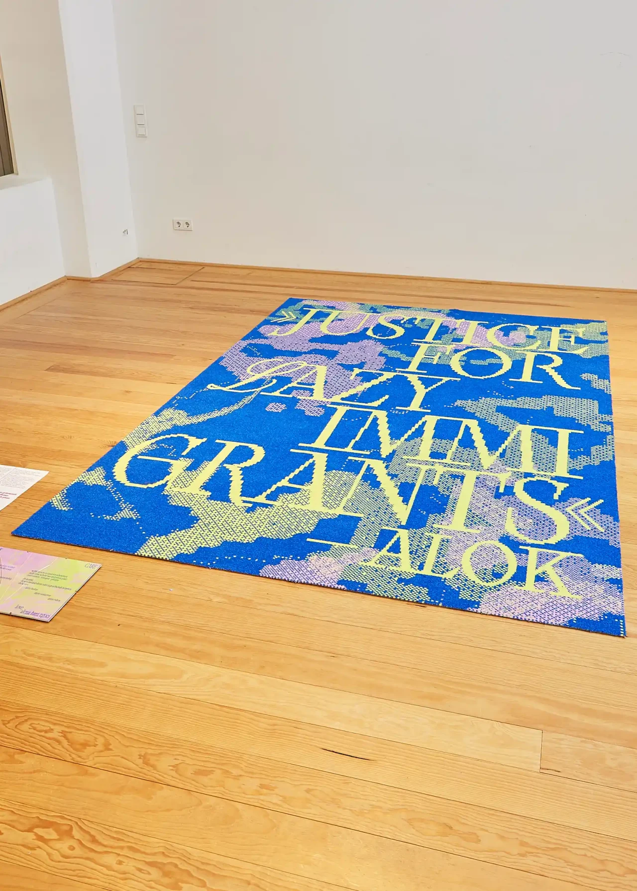 ‹cry – cleanse – care› ist ein forschungsbasiertes Projekt und untersucht die Frage, was Ruhe und Erholung in einer kapitalistischen und patriarchalen Gesellschaft für marginalisierte Personen bedeuten. Wie können wir zeigen, dass Erholung auch ein Akt des Widerstands ist? Wie schaffen wir einen dekolonialen, heilenden Raum? Als eine Gruppe von drei Designstudierenden mit postmigrantischen und dekolonialen Perspektiven erforschen wir Gemeinsamkeiten sowie Unterschiede unserer eigenen Erfahrungen und arbeiten interdisziplinär. Der Appell ‹cry – cleanse – care› ist die Grundlage unseres nichtlinearen Manifestes. Wir laden Besucher*innen ein, das Land der Verletzlichkeit zu betreten – verflochten in einen Teppich. Um zu heilen – zu sein – zu entspannen. «Justice for lazy immigrants!» ist ein Zitat von ALOK aus deren Show in Hamburg im Oktober 2022. ALOK [@alokvmenon] ist ein*e international gefeierte*r Autor*in, Dichter*in, Comedian und Redner*in und erforscht in deren Arbeiten Themen wie Trauma, Zugehörigkeit und den Zustand des Menschen. Andere Zitate in unserem Manifest sind Fragmente aus Tabita Rezaires Essay ‹Decolonial Healing: In Defense of Spiritual Technologies›. Weitere Referenzen sind Mirene Arsanios [@mirenearsanios], Ocean Vuong [@ocean_vuong], Limo [@schreibenmit_limo], Elonë Beqiraj [@elona_beqiraj], Semra Ertan [@semra_ertan_initiative], Belle Room Talks [@belleroom_talks], das ‹Radical Tenderness Manifesto›, ‹Traumagotchi› und die ‹YOYI! Care, Repair, Heal› Ausstellung im Gropius Bau, Berlin. ►Typefaces via SoliType [@solitype], RYM von Fabiola Mejía [@fffffabifabiola], Arthemys Display Bitmap von Morgane Vantorre [@gagane_]