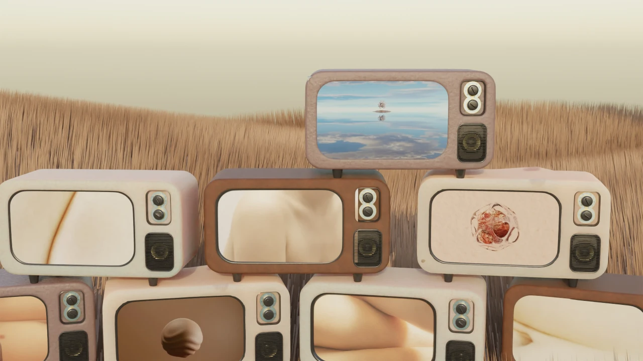 ►Mit welcher Thematik hast du dich in deiner Arbeit auseinandergesetzt? In dem Video-/Soundprojekt ‹fluid bodies› beschäftige ich mich mit Unsicherheiten gegenüber dem Bild des eigenen Körpers. Dafür habe ich die gesellschaftlichen Körperideale in einer utopischen Welt aufgebrochen, sodass sie zu abstrakten Formen werden und einfach existieren können. ►Was sollen die Betrachter*innen aus deinem Projekt mitnehmen? Ich denke, die meisten Menschen haben schon einmal Unsicherheiten wegen ihres Körpers verspürt. Mit dem Projekt möchte ich allen Personen, die sich damit identifizieren, zeigen, dass sie damit nicht allein sind. Nur so können wir uns gemeinsam bestärken und Tabuthemen rund um unseren Körper aufzeigen und auflösen. ►Mit welchen Tools hast du gearbeitet? Beim Video habe ich hauptsächlich mit Blender gearbeitet, wofür ich so einige Youtube-Tutorials durchforsten musste. Dann habe ich die sehr provisorischen, mit dem Smartphone aufgenommenen Videos von meinem Körper eingefügt. Abschließend habe ich die verschiedenen Settings des Videos mithilfe von DaVinci Resolve zusammengeschnitten. Für das Sounddesign habe ich ausschließlich kostenfreie Sounds aus Datenbanken verwendet. Diese habe ich dann in Audacity zusammengefügt und mit dem Video abgestimmt. ►Was hat dich inspiriert? Heutzutage wird die gesellschaftliche Problematik der Körperunsicherheiten zum Glück schon in manchen Bubbles offen aufgegriffen. Jedoch sind wir noch weit von einer großflächigen Akzeptanz jeder Form eines Körpers entfernt. Somit wollte auch ich einen kleinen Beitrag zu dem Thema leisten, da es mich selbst schon mein Leben lang verfolgt und beschäftigt. Als Medium, um das Projekt zu verwirklichen, wollte ich unbedingt mit Blender arbeiten, um meine Skills dort aufzufrischen und zu erweitern. Durch diesen Rahmen hat sich die Ästhetik des Videos dann von selbst entwickelt. ►Was hast du im Prozess gelernt? Als Allererstes: Viele neue Blender-Skills, von denen ich leider einen Großteil schon wieder vergessen habe. Des Weiteren: meinen eigenen Umgang mit dem Thema: Es war natürlich ungewohnt, Videos in meinen ‹unvorteilhaftesten› Posen aufzunehmen und diese dann im Designprozess ständig zu sehen – also ständig mit den eigenen Unsicherheiten konfrontiert zu sein. Außerdem dann das Video mir nahestehenden, aber auch vielen fremden Menschen zu zeigen. Doch gerade dadurch bin ich einer Akzeptanz meines eigenen Körpers ein großes Stück näher gekommen. ►Was ist dir an deinem Projekt besonders wichtig? Ich möchte die Aufmerksamkeit und Sichtbarkeit des Themas in meinem eigenen Stil weiter vorantreiben. Hoffentlich fühlt sich die eine oder andere Person gesehen und bestärkt.