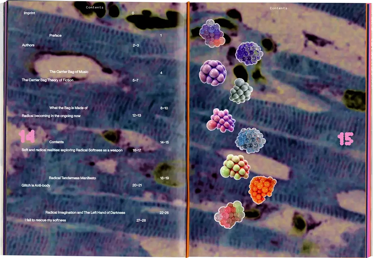 ►Kannst du dich und dein Projekt kurz vorstellen? In meiner Abschlussarbeit habe ich Formen der Radikalität untersucht und plädiere hierbei für ein breites Narrativ, da Radikalität zu oft in den Kontext von Gewalt oder Krisen gesetzt wird. Wir brauchen meiner Meinung nach aber Radikalität, um eine bessere Gesellschaft zu werden*. In meiner Arbeit wird Perspektiven Raum gegeben, die einen radikalen Ansatz in ihrem Schaffen verfolgen. Sie ist eine Sammlung von Texten, Farben, Haptik und Sound und bildet eine persönliche Darstellung von Radikalität in künstlerischer Form. Die Art, wie wir kommunizieren, erzählen und gestalten, kann ein erster Ansatz für die Veränderung eines Zustands in der Gesellschaft sein, weshalb wir uns radikal mit Verhältnissen auseinandersetzen müssen, was ich sowohl privat als auch in meiner gestalterischen Arbeit tue. ►Der Name lässt Raum für Fragen. Kannst du erzählen, wie du darauf gekommen bist? Und vielleicht auch was er für dich bedeutet? Der Titel der Arbeit kommt vor allem aus meinem theoretischen Teil. Für mich war das Erarbeiten der Theorie sehr bedeutsam. Da ich mich der Radikalität und vor allem der Radikalen Zärtlichkeit gewidmet habe, kommt dies auch im Titel vor. Ich spanne innerhalb der Arbeit den Bogen zur mittlerweile [zum Glück] ‹trending carrier bag of theory of fiction›, in der es heruntergebrochen ums Sammeln und um antipatriarchales [Geschichten-] Erzählen geht. Dieser Ansatz geht für mich eben auch mit dem Konzept der radikalen Zärtlichkeit einher, weil es hier vor allem darum geht, den rassistischen und kapitalistischen Status quo unserer Gesellschaft zu überwinden. Dieser fußt, wie wir ja alle wissen auf dem Patriarchat. Die Tragetaschentheorie kommt also auch im Titel vor. ►Kannst du uns einen Einblick in deinen Gestaltungsprozess geben? Wie bist du vorgegangen? Wie gesagt, ich habe mich vorangehend eher mit der Theorie beschäftig und dann kam sehr intuitiv ein visuelles Konzept in Farben, Formen und Stofflichkeiten dazu. Ich wollte räumlich arbeiten und habe versucht einen Ort zu schaffen, an dem Besucher*innen beobachten könnten, ohne lediglich konsumieren zu müssen. Ich wusste bis zum Tag vor der Prüfung nicht, wie alles letztendlich im Raum aussehen würde, weshalb ich flexibel denken musste. Ein Netz, was begehbar ist als Anlehnung an die Carrier Bag. Die Kissen symbolisieren Körper, weil diese grundlegend für Radikalität sind. Jeder Gegenstand der Installation hat einen metaphorischen Bezug zur Theorie. Der Reader und die Audiovisionen waren mir wichtig als ein Format, welches Wissen und Gedanken in textlicher Form enthält. Die gesammelten Texte darin haben mich teilweise auch bei der Gestaltung inspiriert. Das Mini-Manifesto kam zum Schluss dazu und ist meine persönliche Schlussfolgerung aus der Theorie, wo ein radikal zärtlicher Ansatz nochmals festgehalten wird. Während der Ausstellung gab es auch Sound, der passend zum Konzept komponiert war. Das war für die räumliche Atmosphäre auch noch mal wichtig. ►Mit welchen Techniken hast du gearbeitet? Ich habe vor allem gelesen und es war total schön, sich so tiefgreifend mit einem Thema auseinandersetzen zu können. Ich habe auch genäht, gefärbt, kleine Skulpturen gemacht. Für die Printsachen hab ich gesiebdruckt und riso-gedruckt und mir eine Bindung überlegt, die zum Konzept passt. Eine Freundin hat manche Texte eingelesen, falls man nicht lesen will oder kann. Es war viel Trial-and-Error, aber insgesamt hat mir das Arbeiten an dem Projekt viel Spaß gebracht. ►Wer hat dich inspiriert? Die, die sich mit radikalen Ansätzen für eine bessere Gesellschaft auseinandersetzen und das in textlicher oder visueller Form festhalten. Die Autor*innen, die ich im Reader gesammelt habe, Seyda Kurt, der Cyber Feminism Index und Freund*innen, die sich mit ähnlichen Themen beschäftigen. ►Was fühlst du, wenn du auf dein Projekt schaust oder an dein Projekt denkst? Erstmal fühle ich eine Art Nostalgie, weil mit diesem Projekt mein erstes Studium und damit prägende Jahre zu Ende gingen. Ich hab die Arbeit an so einem intensiven Projekt sehr genossen und denke gern an die Bachelormonate zurück. Wobei die Arbeit an dem Thema damit nicht abgeschlossen ist, das sind ja oft auch Lebensthemen, mit denen man sich da beschäftigt. Ich merke auch immer erst in so Momenten, wenn ich darüber schreibe oder spreche – wie jetzt gerade –, was alles dahinter steckt und was man von außen betrachtet vielleicht erstmal gar nicht wahrnimmt. ►Was ist dir besonders wichtig an deinem Projekt? Mir ist wichtig, dass wenn wir uns als Designer*innen oder Künstler*innen politischen Themen widmen, dabei authentisch bleiben müssen. Das heißt für mich auch, sich nicht politischen Verhältnissen bedienen und daraus oder damit Gestaltung machen. Politisch zu sein muss beim Menschen anfangen, nicht erst bei der Gestaltung. Meine Arbeit ist auch nicht in-your-face-politisch, im ersten Moment ist sie einfach schön anzusehen. Aber da es ein sehr persönliches, bedachtes Projekt ist, finde ich das okay. Ich wollte zärtlich zu mir und meinem Gestaltungsprozess sein und hab daher auch etwas Abstand genommen zu den typischen Methoden, die ich bisher im Studium erlernt habe.